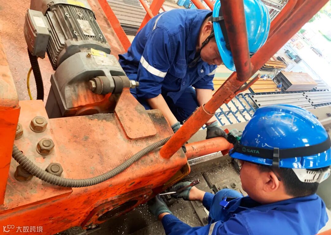 ▲设备运维工蔡永刚、张骁斌开展六联跨20T行车轨道及行走轮检查测量工作