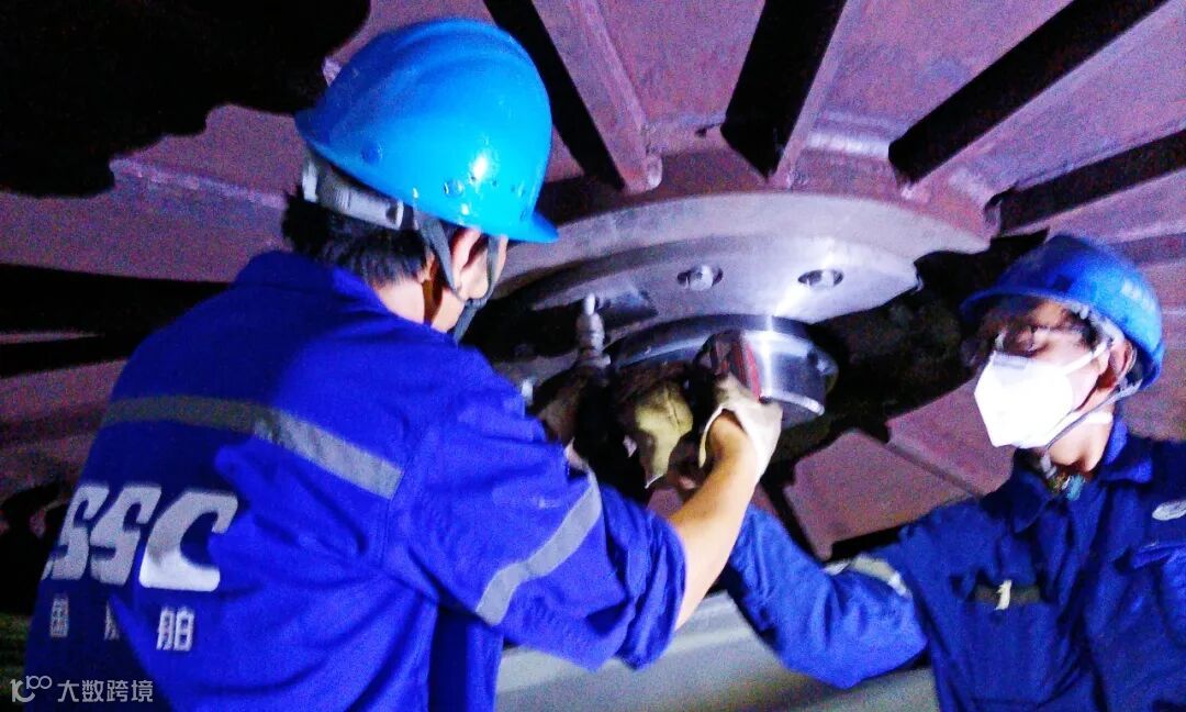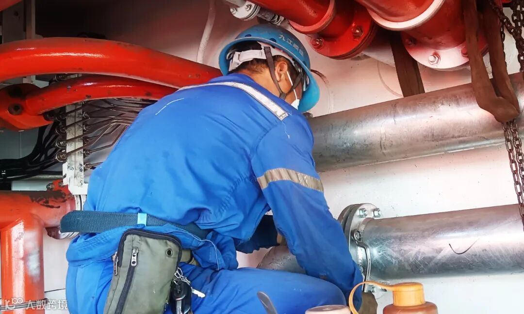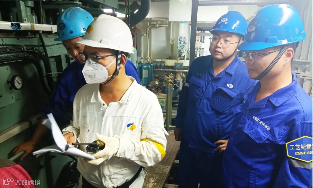 ▲设计院技术人员靳亚中、李裕波、刘源配合船东及现场人员进行主推进系统报检