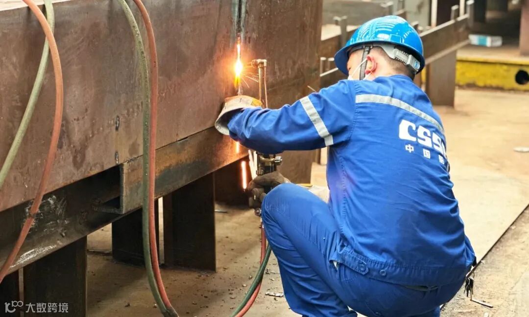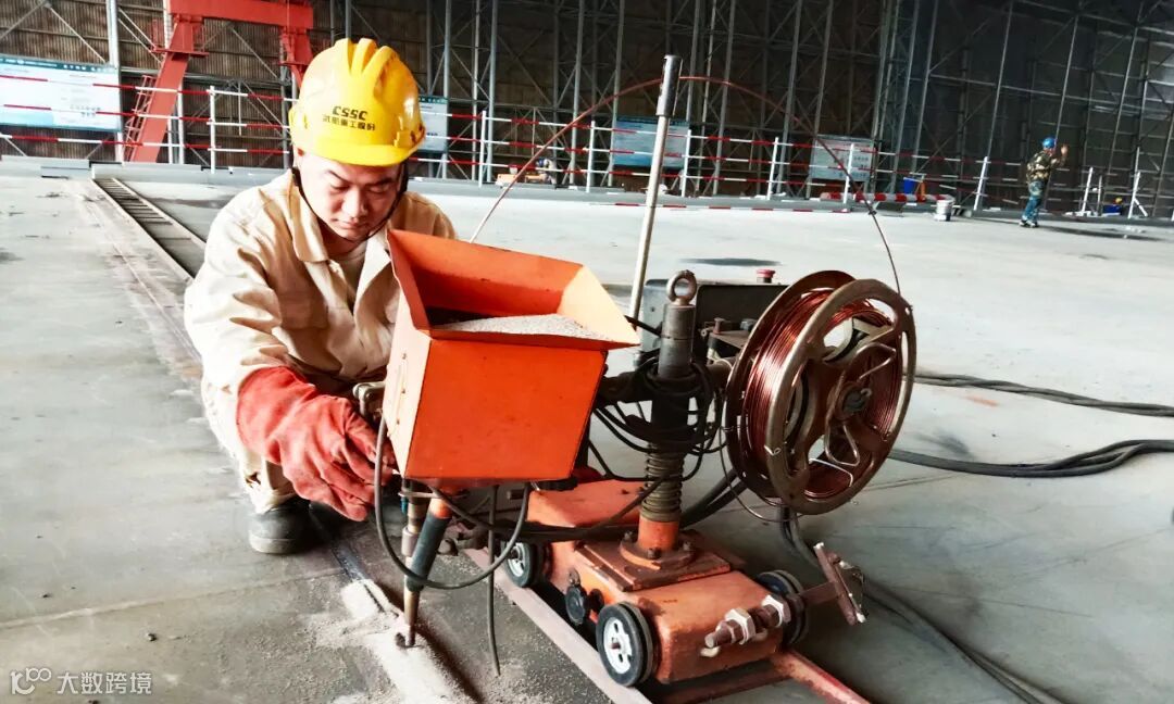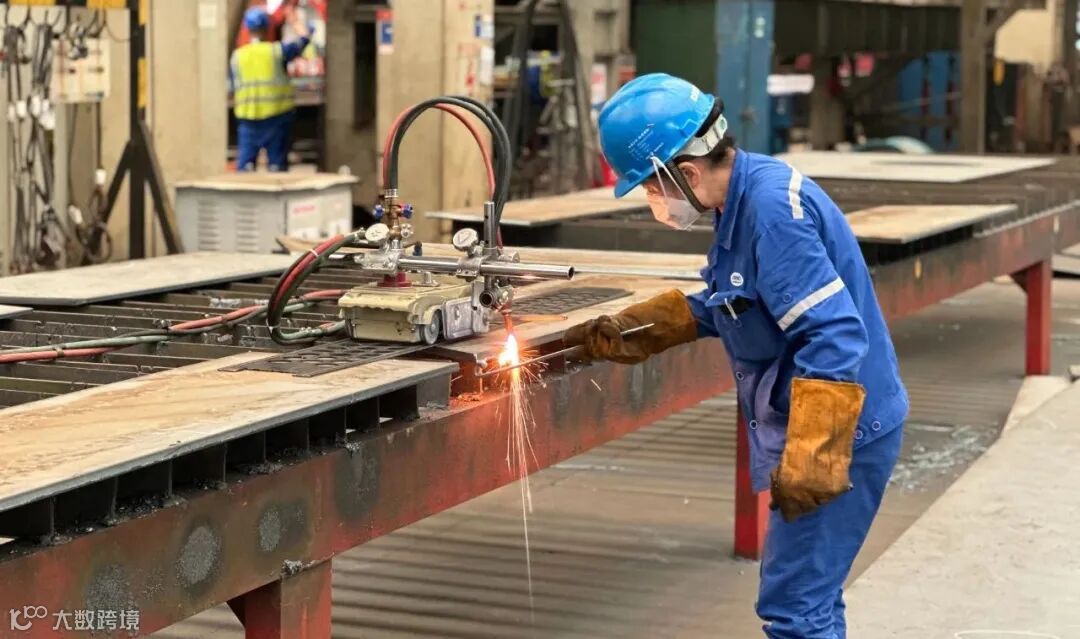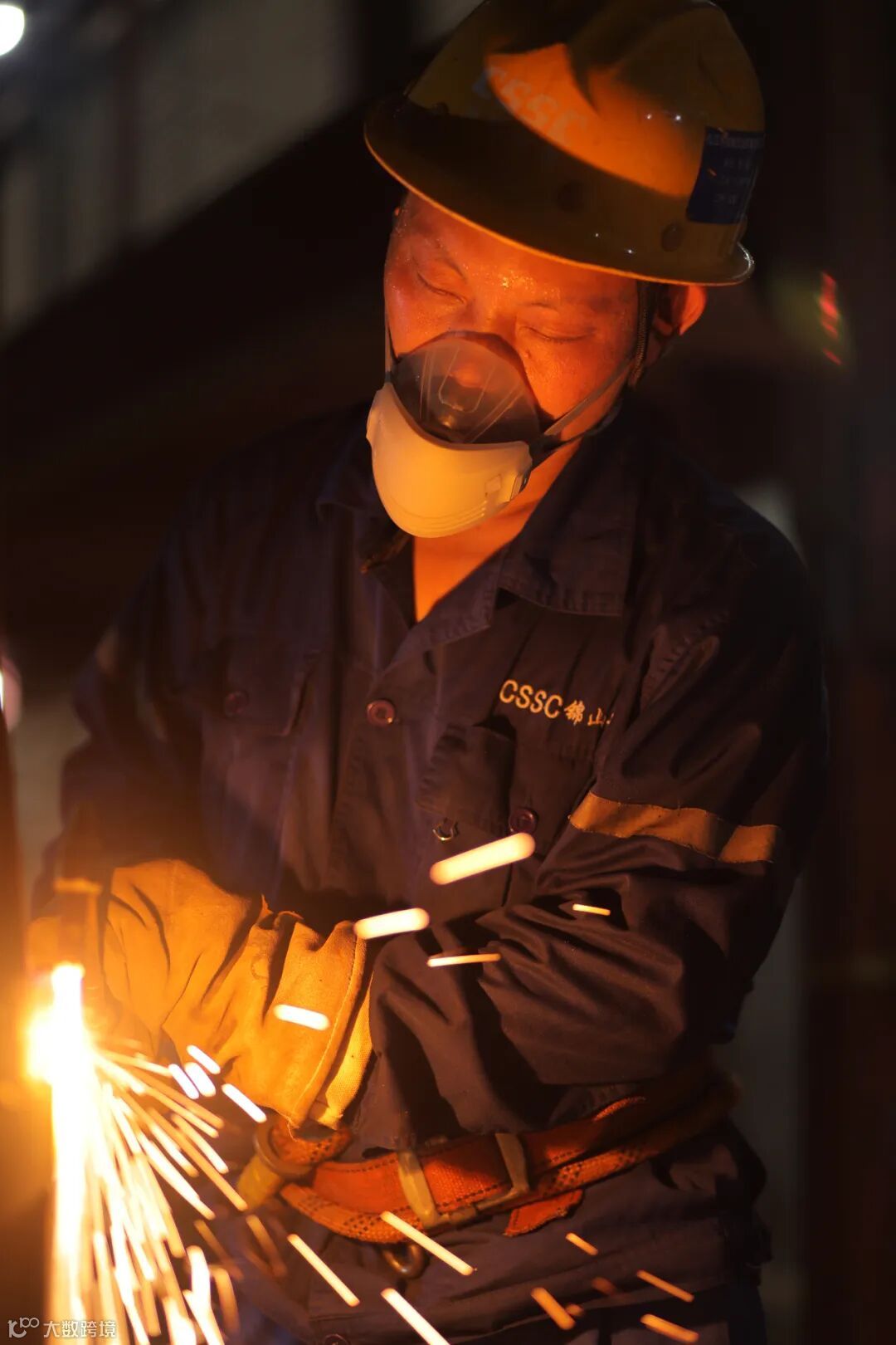 ▲分段部中小组立作业区装配工胡俊杰正对1100TEU集装箱船5号船进行坡口切割作业