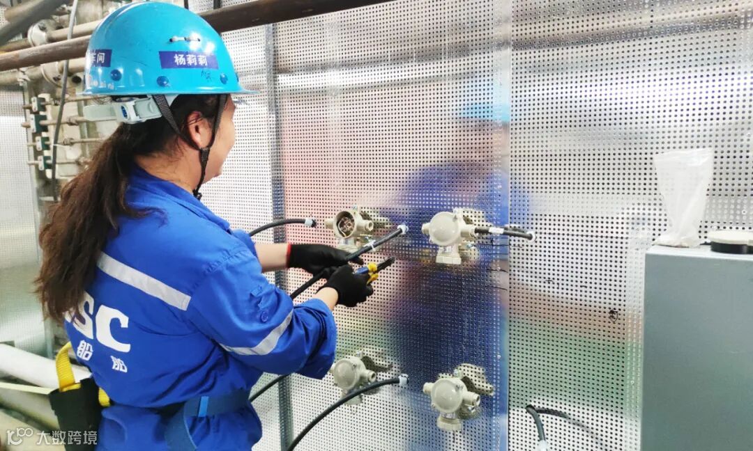▲总装部电装车间船舶电工明喜瑞进行变压器清洁工作