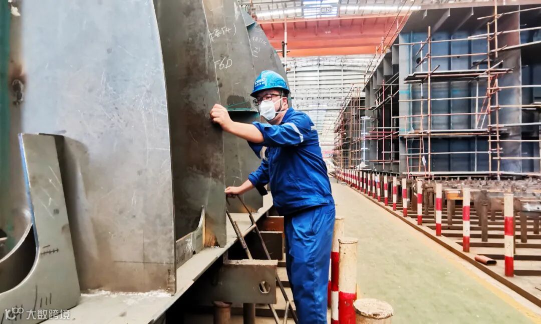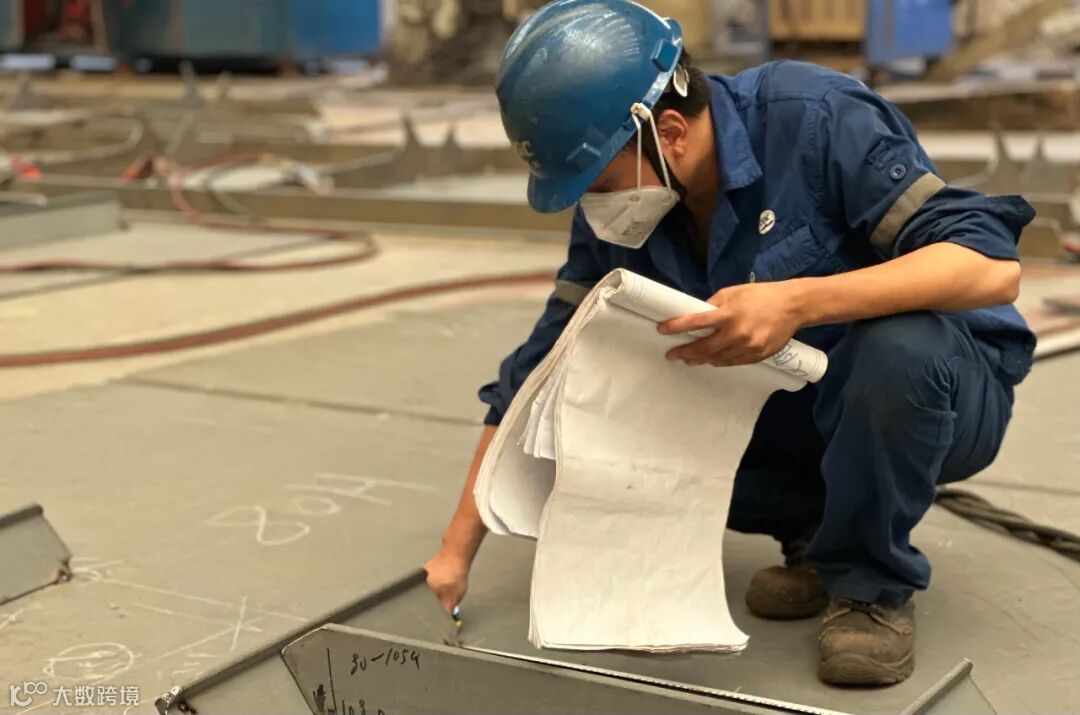 ▲生产管理部建造师喻浩正在检查分段建造进度