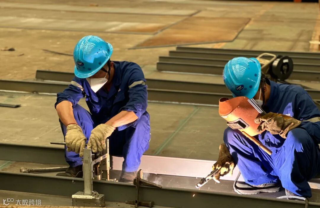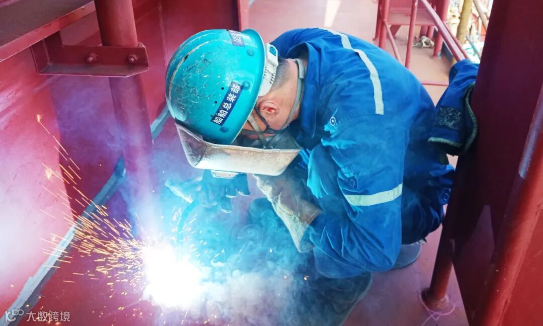 ▲总装部船台车间电焊工金业正在1100TEU集装箱船2号船上进行焊接工作