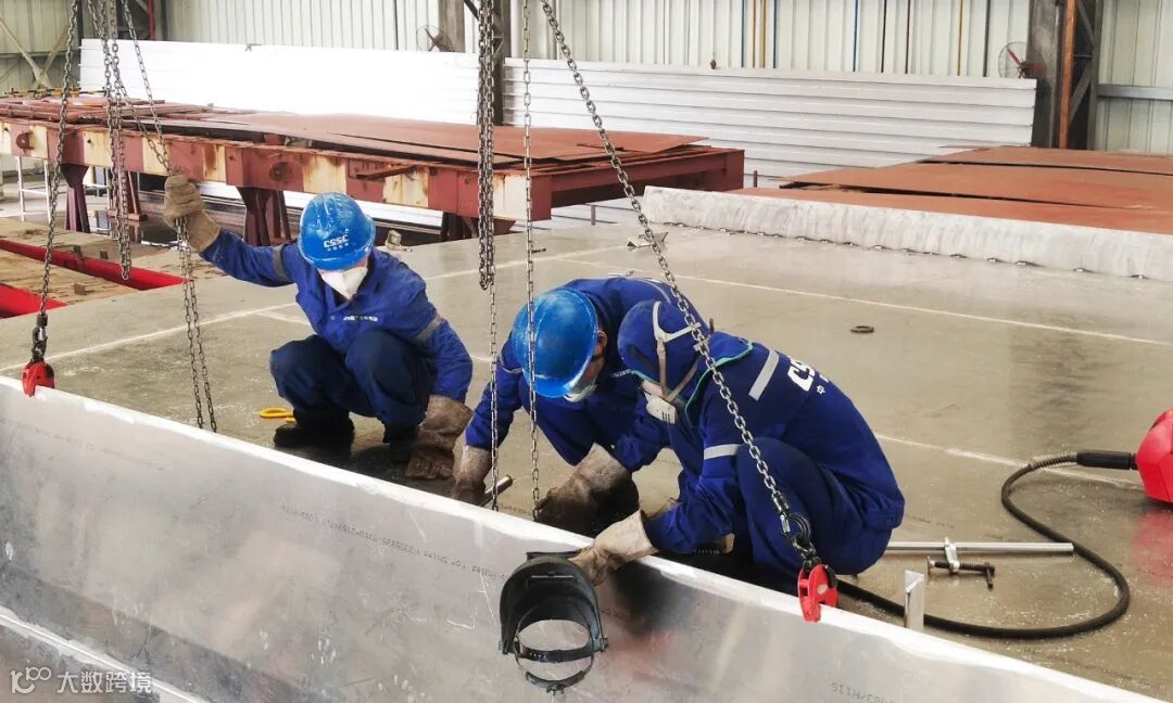 ▲重装公司重型结构部装配工朱云飞带领班组成员在1100TEU集装箱船3号船船舱口盖面板上装焊球扁钢和T型材