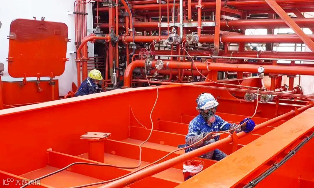 ▲总装部管装车间吴正旺船进行新增压载水处理系统管路安装