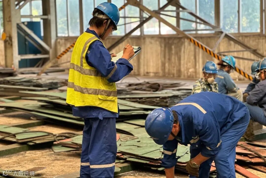 ▲分段部切割及加工作业区配套员叶麟正带领班组进行部件分拣工作