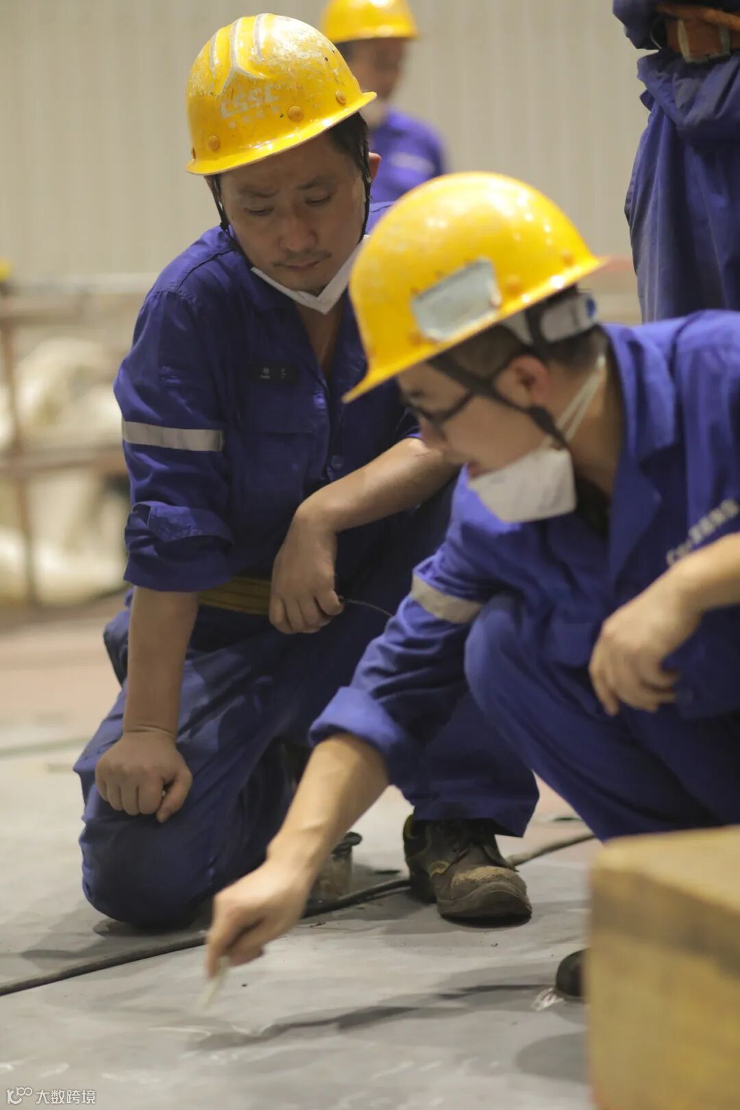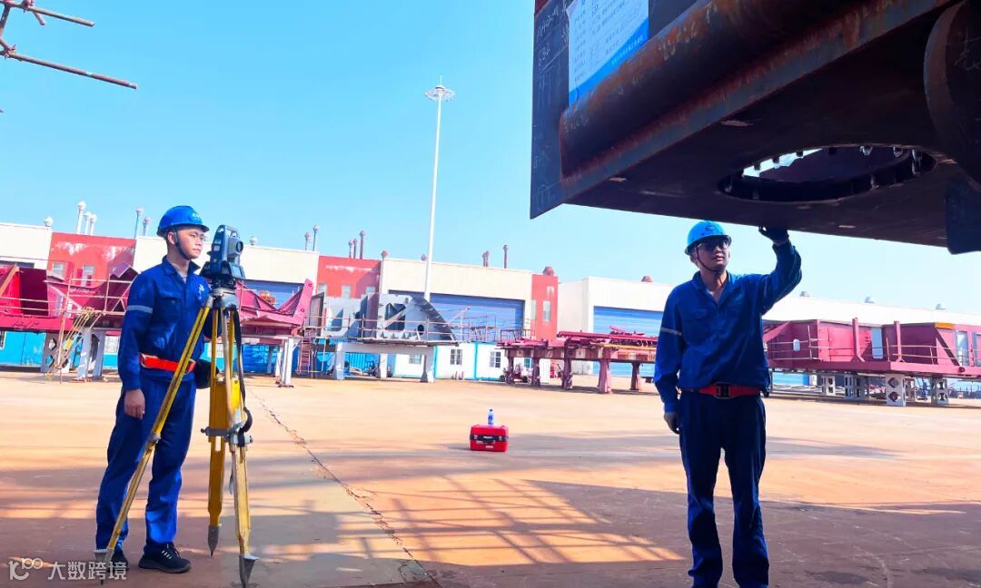 ▲生产管理部精度管理员李晓东和沈彬正在开展分段完工精度测量工作