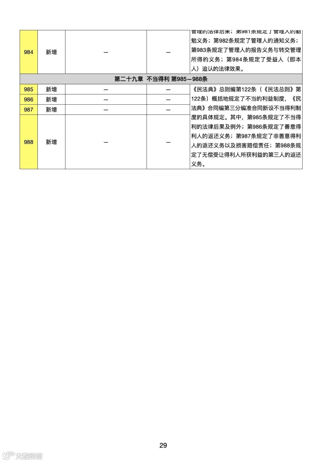 再次,物权编、婚姻家庭编、继承编以及侵权编有少数条文为新增,例如物权编第14章新增一类用益物权居住权的相关规定、侵权编第1217条关于“好意同乘”的责任减轻规则等;最后,总则编没有新增条文。