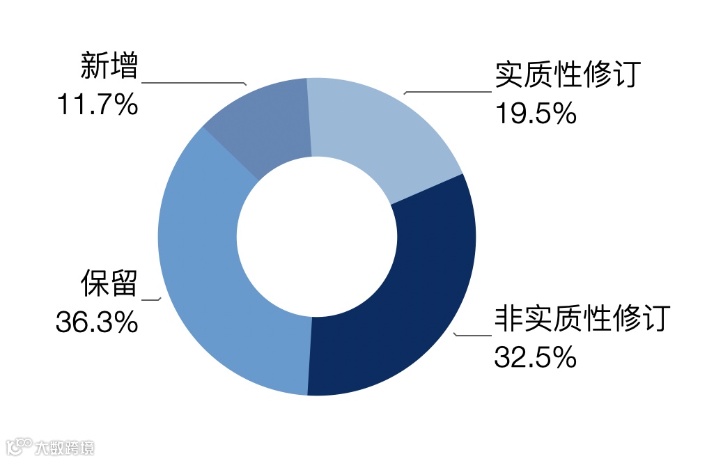 其次,有62个法条根据上述相关法律修订而来,其中有30个法条为非实质性修订,主要是文字、表述、法条引用和标的符号的修订或调整;其中有32个法条为实质性修订,主要包括对主体范围的明确、删除部分限制条件、扩大了规制或保护范围等;