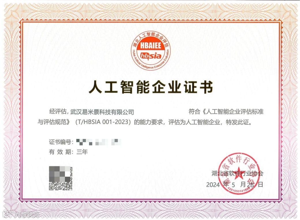 此次成功认定,不仅是对易米景科技的技术实力及服务能力的认可,也激励了公司坚持高质量发展的信心。易米景科技将以此为契机,创新科技,持续深耕技术研发,求真务实,不断丰富行业应用,引领人工智能行业应用创新发展,为客户提供更优质的服务,同时为提升人工智能产业总体发展水平贡献科技力量。