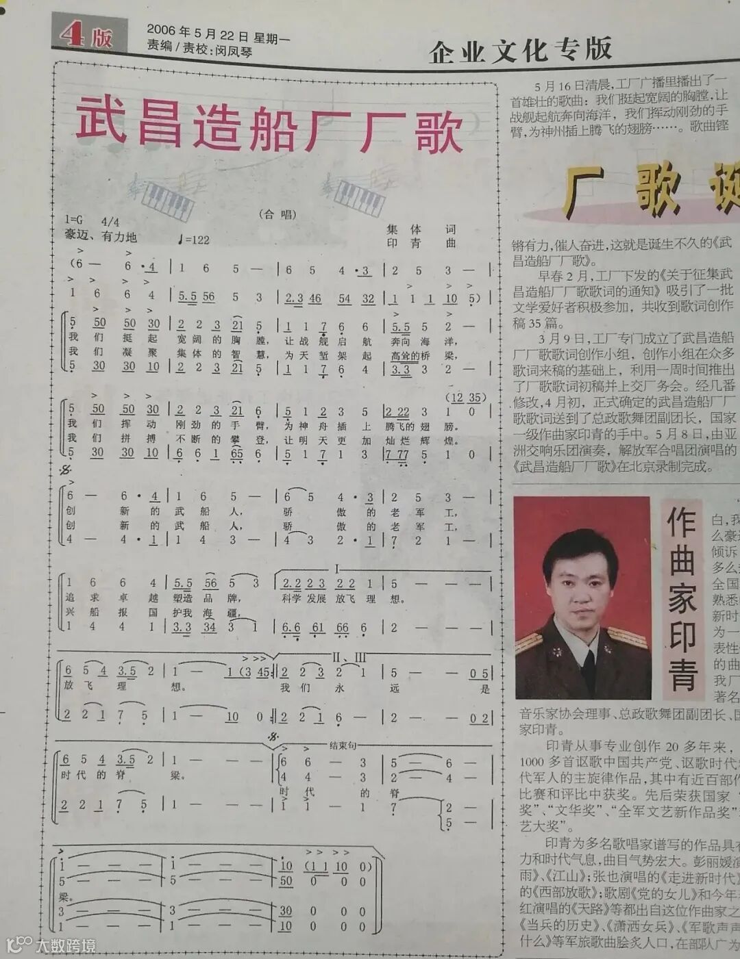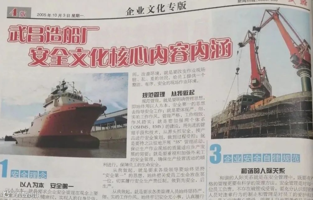 公司在2001年、2005年进行了第一次和第二次深潜试验,党委宣传部对深潜试验涌现出的典型人物和精神进行宣传,“滴水不漏”“拼搏协同”“创新奉献”等理念成为了武昌造船军工精神的集中体现。