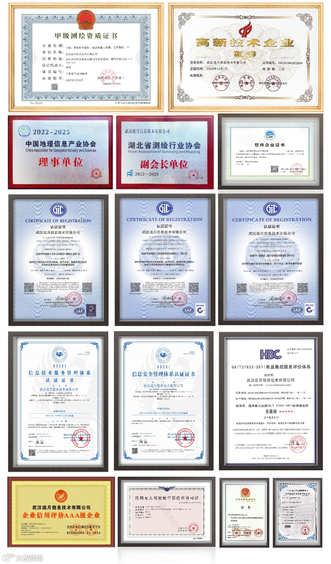公司现为中国地理信息产业协会理事单位、湖北省测绘行业协会副会长单位、湖北省测绘行业协会时空大数据工作委员会主任委员单位。公司已获得甲级测绘资质、高新技术企业资质、双软企业认定、ISO9001质量管理体系认证、售后服务评价体系五星认证、信息技术服务管理体系认证、信息安全管理体系认证、武汉市守合同重信用企业、AAA信用等级、湖北省优秀测绘工程奖等多项荣誉资质。