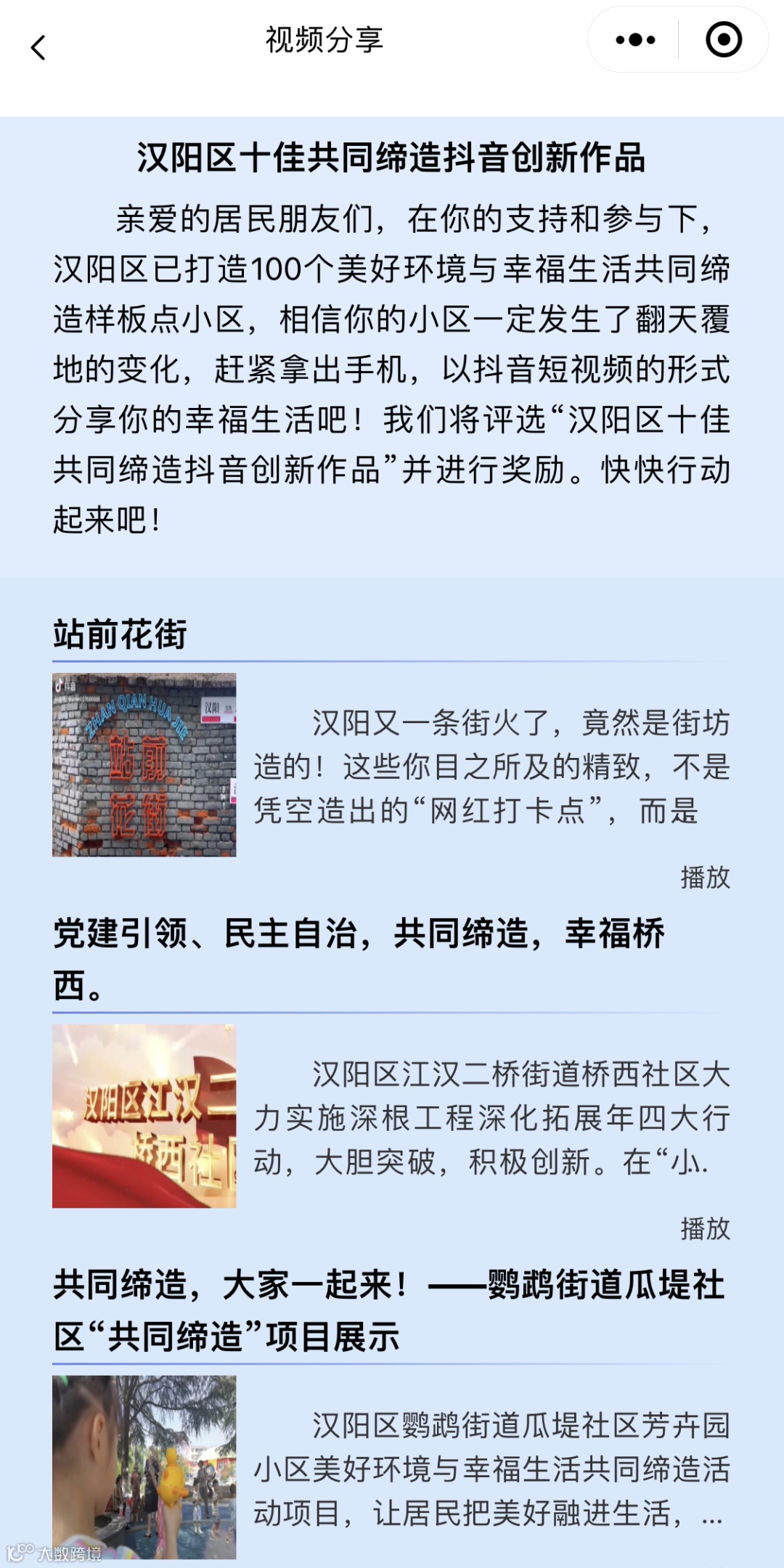 “汉阳区美好环境与幸福生活共同缔造共建共评平台”共分为“幸福汉阳 共同缔造”小程序、数据驾驶舱和后台管理系统三个部分。