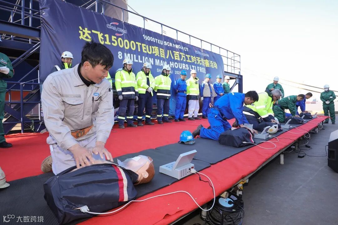 活动现场,船东对建造项目组现场奖励10万人民币,并分别为5个部门颁发“八百万工时无事故”纪念奖杯,对5名安全标兵颁发纪念奖杯、奖品。公司优秀班组现场开展岗位安全分析班前会,生产部门与船东建造组开展心肺复苏比赛。