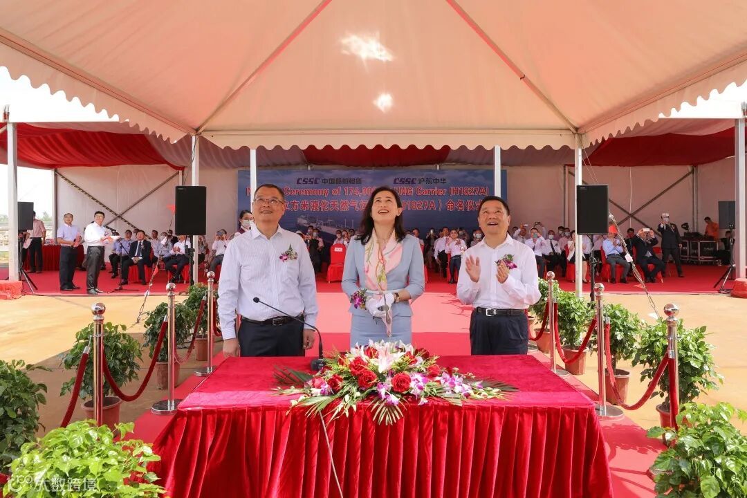 中国船舶租赁总经理胡凯和公司总经理陈军在仪式上致辞。教母王静女士为新船砍缆敲香槟,将其命名为“木兰”号。公司副总经理金燕子向教母赠送鲜花,公司副总经理迟本斌向教母赠送纪念品。来自中船租赁、浦发银行、商船三井、法国GTT公司、英国劳氏船级社、中国船级社的各方嘉宾80余人参加仪式。
