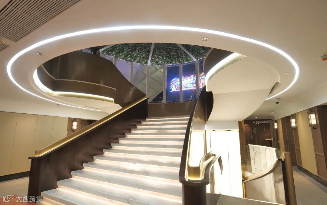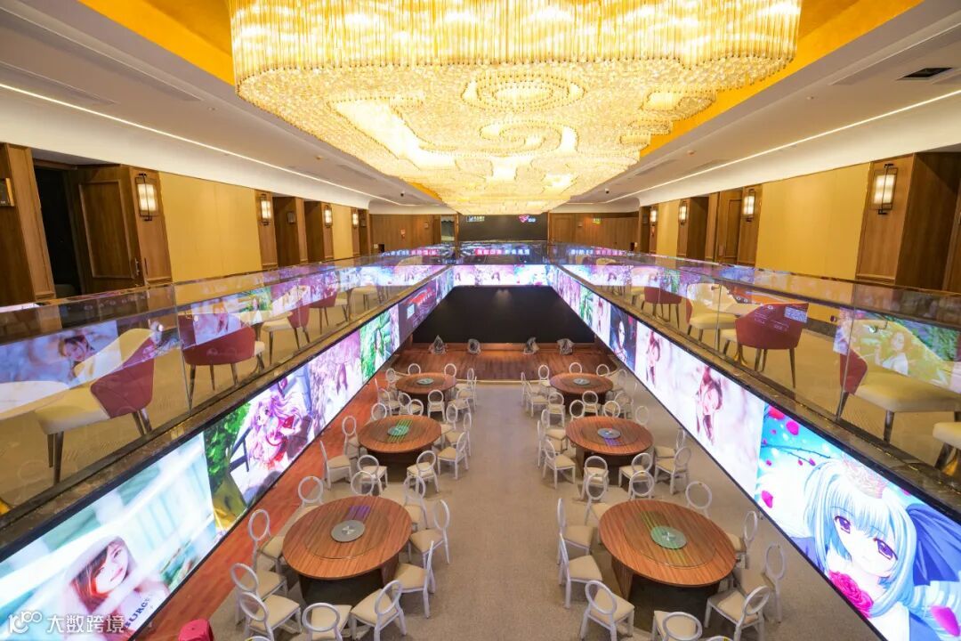 中间镂空区域设置环形曲面LED屏,根据情景需要播放片源,让一楼、二楼大厅欢快娱乐的气氛瞬间拉满。