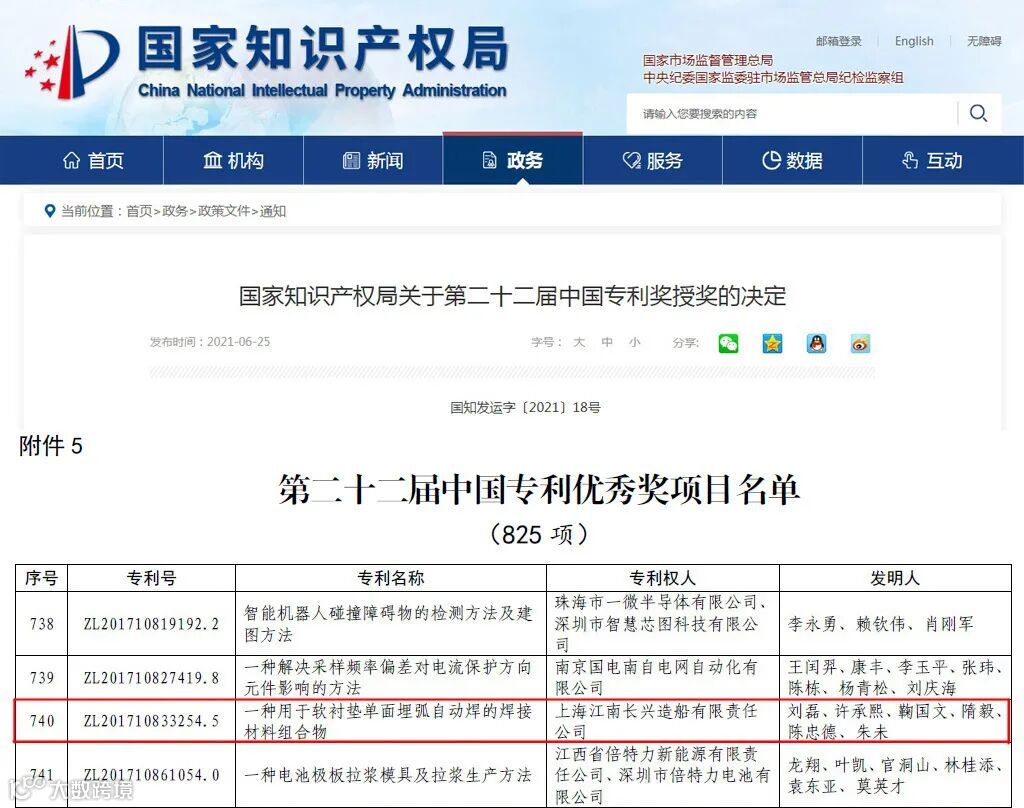 近日,第二十二届中国专利奖评选揭晓,我公司申报的“一种用于软衬垫单面埋弧自动焊的焊接材料组合物”专利荣获优秀奖。