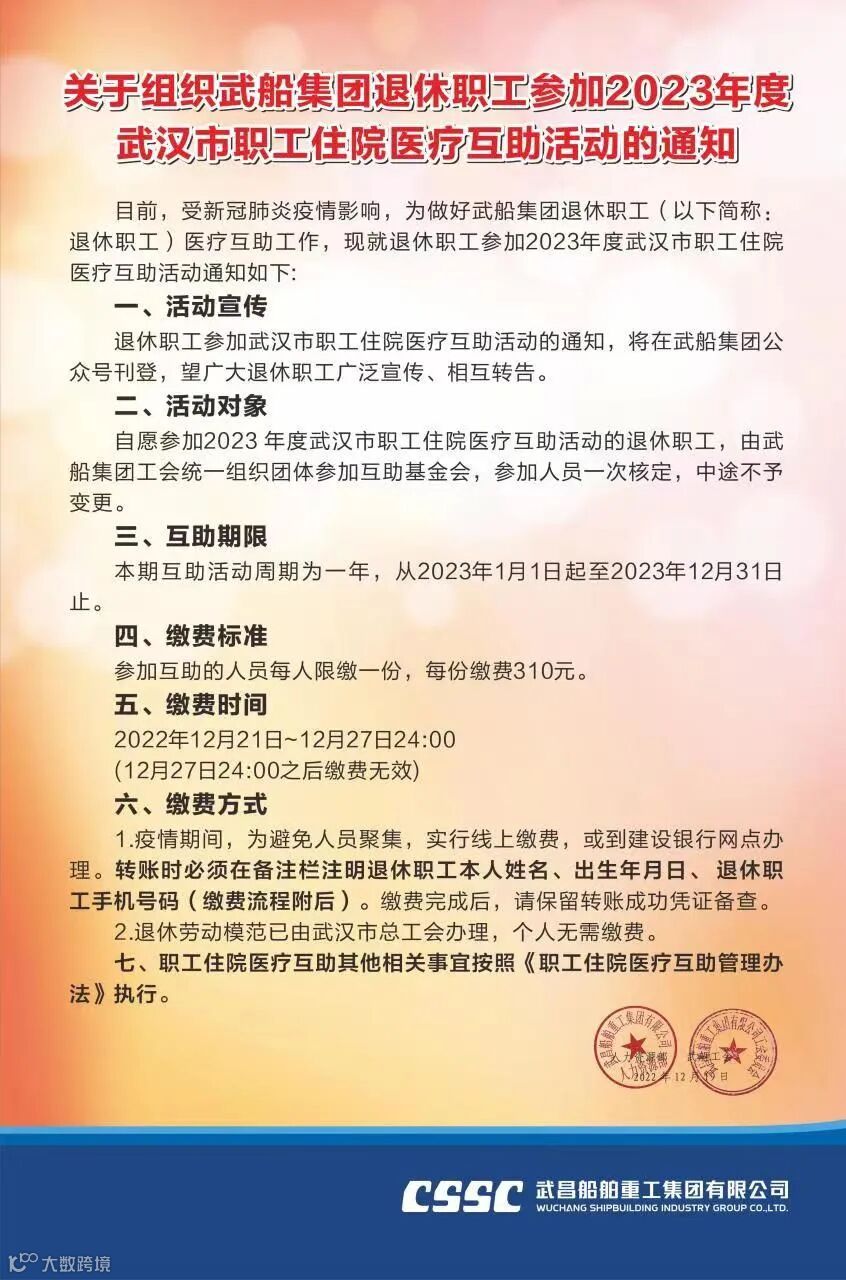导读:关于武船集团退休职工参加2023年度武汉市职工住院医疗互助活动的通知