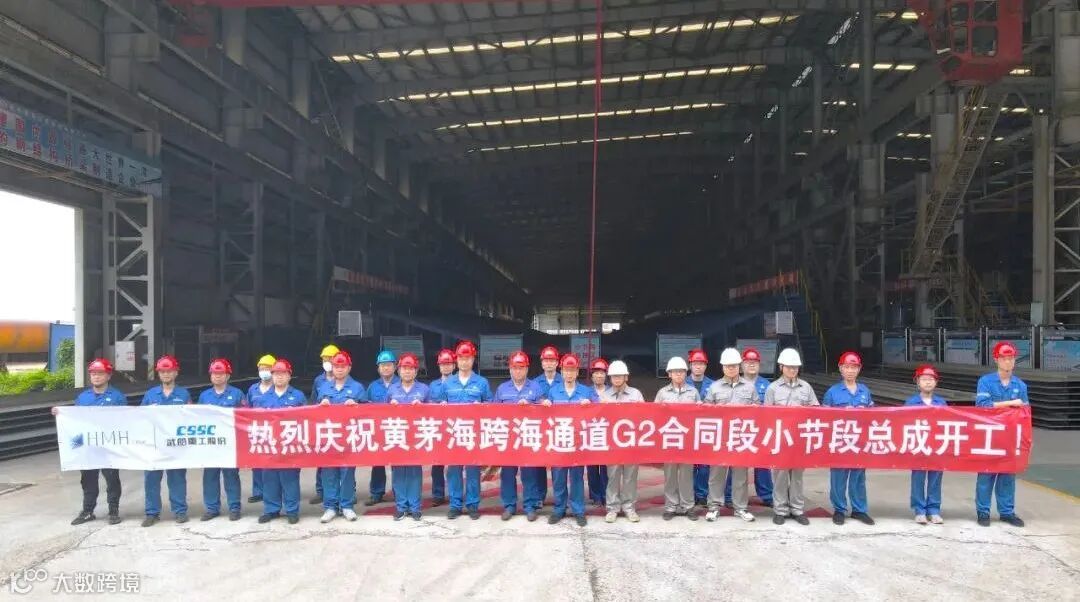 6月18日8时28分,黄茅海跨海通道G2合同段节段总拼开工仪式在中国船舶武船重工公司中山基地举行,标志着项目正式进入钢箱梁总装制造阶段。G2合同段是黄茅海跨海通道项目率先开始钢箱梁节段总拼制造的标段。
