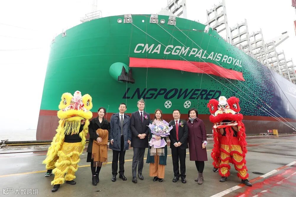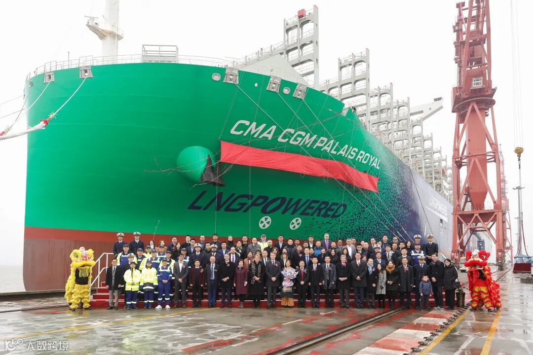 为法国达飞集团建造的全球最大23000TEU双燃料集装箱船“达飞皇家宫殿”号在长兴岛成功命名交付。