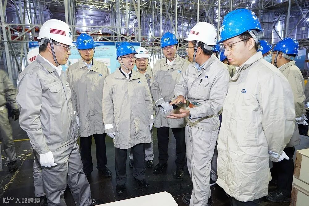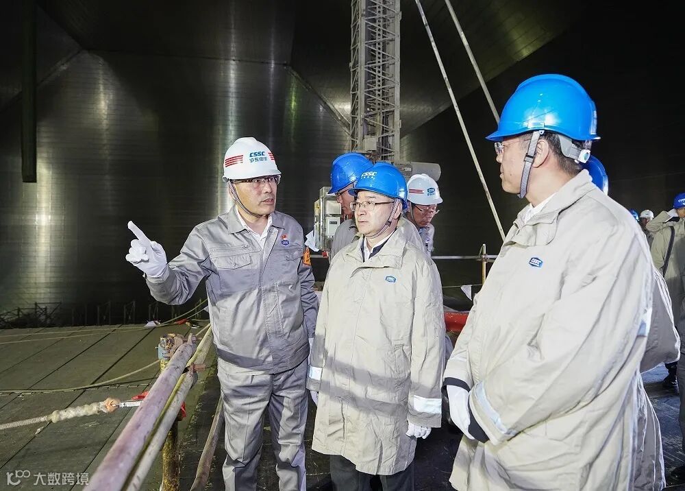 田玉龙一行考察了公司在建LNG船,详细了解了LNG船最核心部分——液货围护系统的建造流程,询问了公司LNG装备产业链技术攻关、设计建造中的关键技术和难点以及企业生产经营情况。