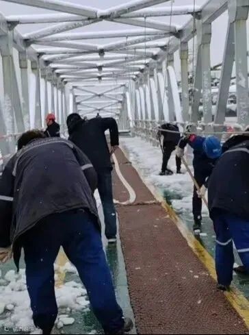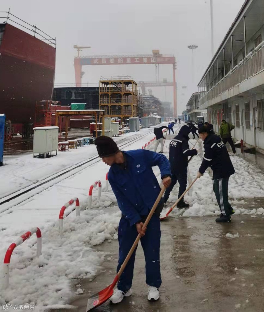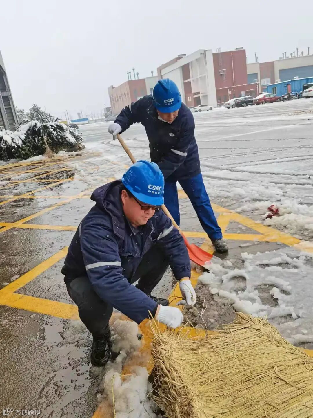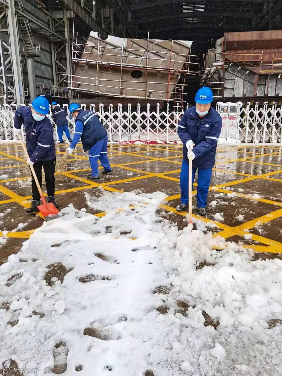 船舶分段部、总装部、起运工程部、模块公司等,迅速启动清雪预案,大家在各自区域,组织加班的干部职工齐心协力,清积雪、除积冰,防滑草垫,还在上下斜坡、室内楼梯、登高斜梯等区域设置了10余个防滑警示标识,为关键设备管路包裹了保温防冻隔层,最大限度保障了冰雪天气环境中职工行走、车辆行驶和设备使用安全。