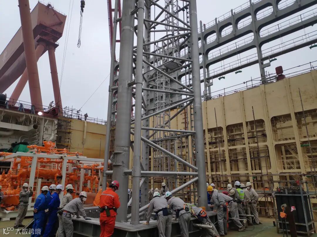 5月4日, 第3艘23000TEU集装箱船顺利完成泵塔及液穹顶盖的吊装工作,标志着该船燃料舱系统的主体安装工程基本结束,向出坞节点迈出重要一步。