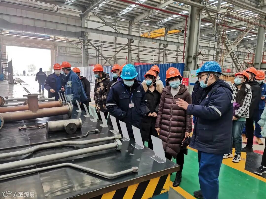 雷静同师生一道深入现场,参观六联跨、室外船台、下水滑道等船舶生产设施,登上了正在码头系泊试验的船舶,并参观智能管加生产线。