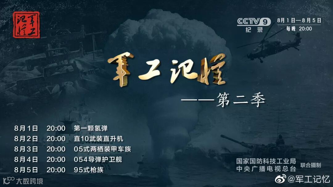7月30日下午,记者从国家国防科技工业局获悉,由国防科工局和中央广播电视总台联合出品的《军工记忆》第二季5集武器装备型号纪录片,将于8月1日至5日晚8点在央视纪录频道(CCTV-9)播出。