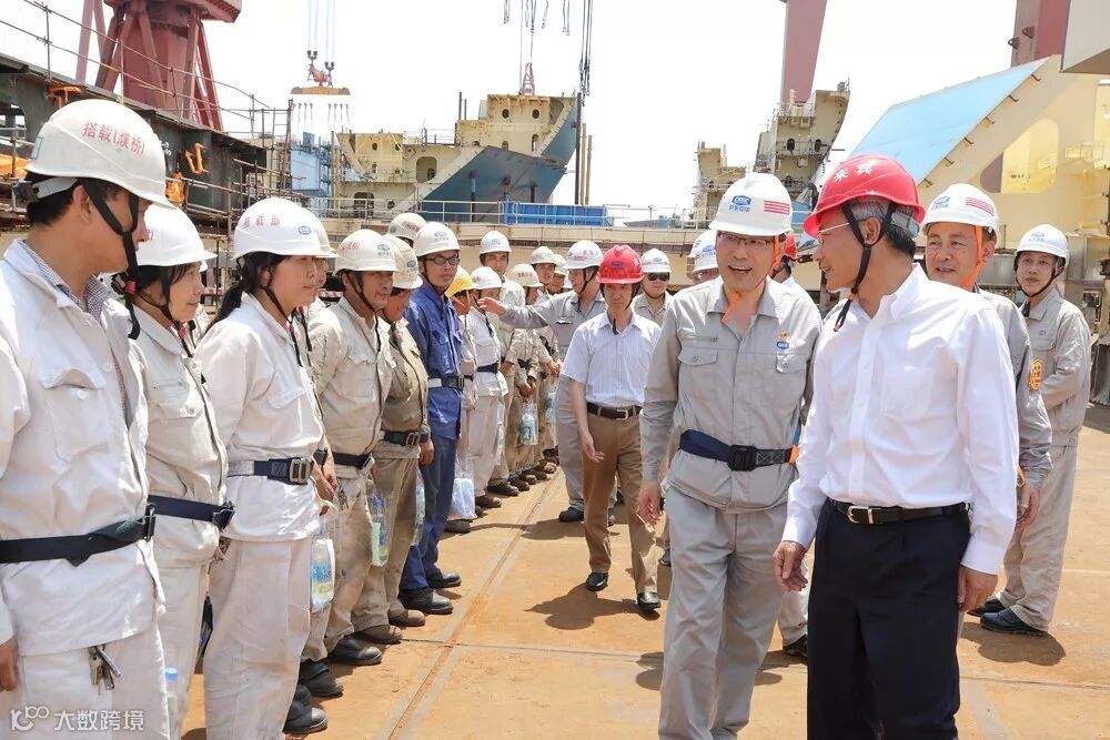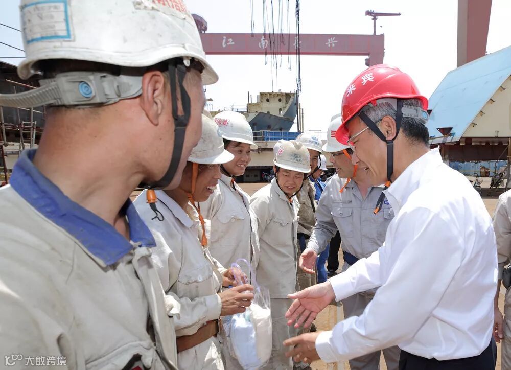 7月23日下午,崇明区委书记唐海龙、人大常委会副主任邢建良等一行在公司董事长、党委书记陈建良,常务副总经理黄一平的陪同下,来到长兴造船1号船坞平台,为酷暑中坚守岗位的造船工人送去防暑降温物品,让奋战一线的造船工人在大暑日感受到丝丝凉意。