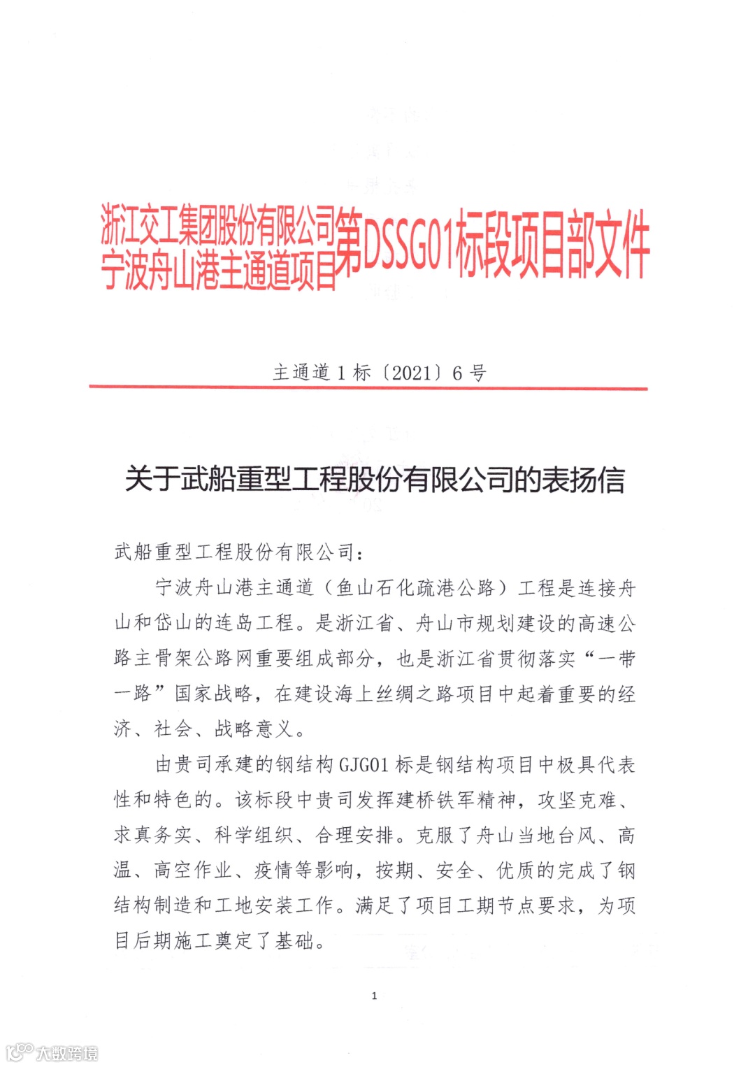 8月23日,中国船舶武船集团武船重工股份收到了宁波舟山港主通道项目DSSG01标项目部发来的表扬信,信中高度赞扬武船重工股份为大桥建设作出的突出贡献。