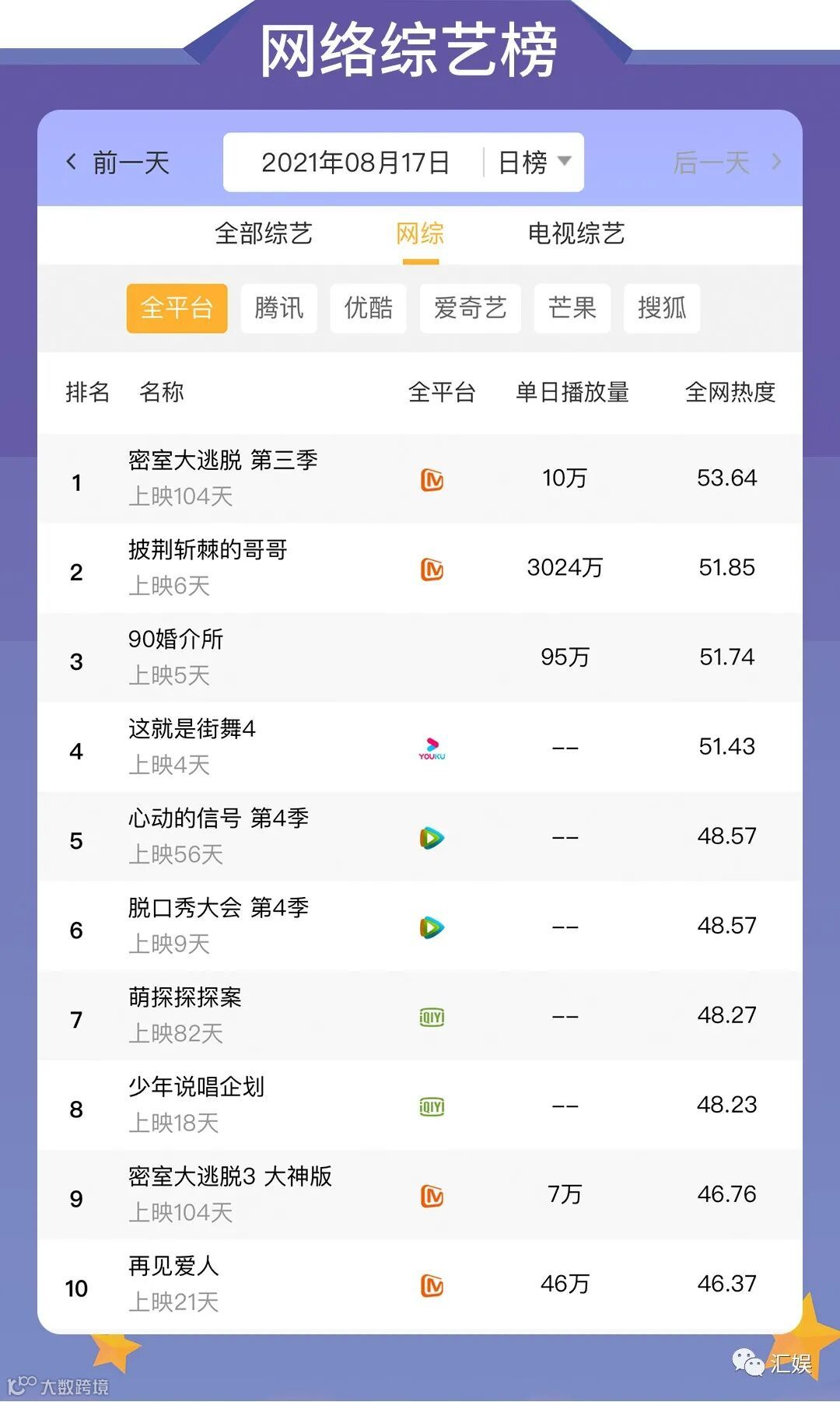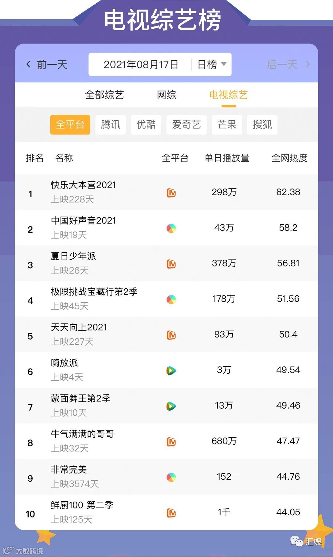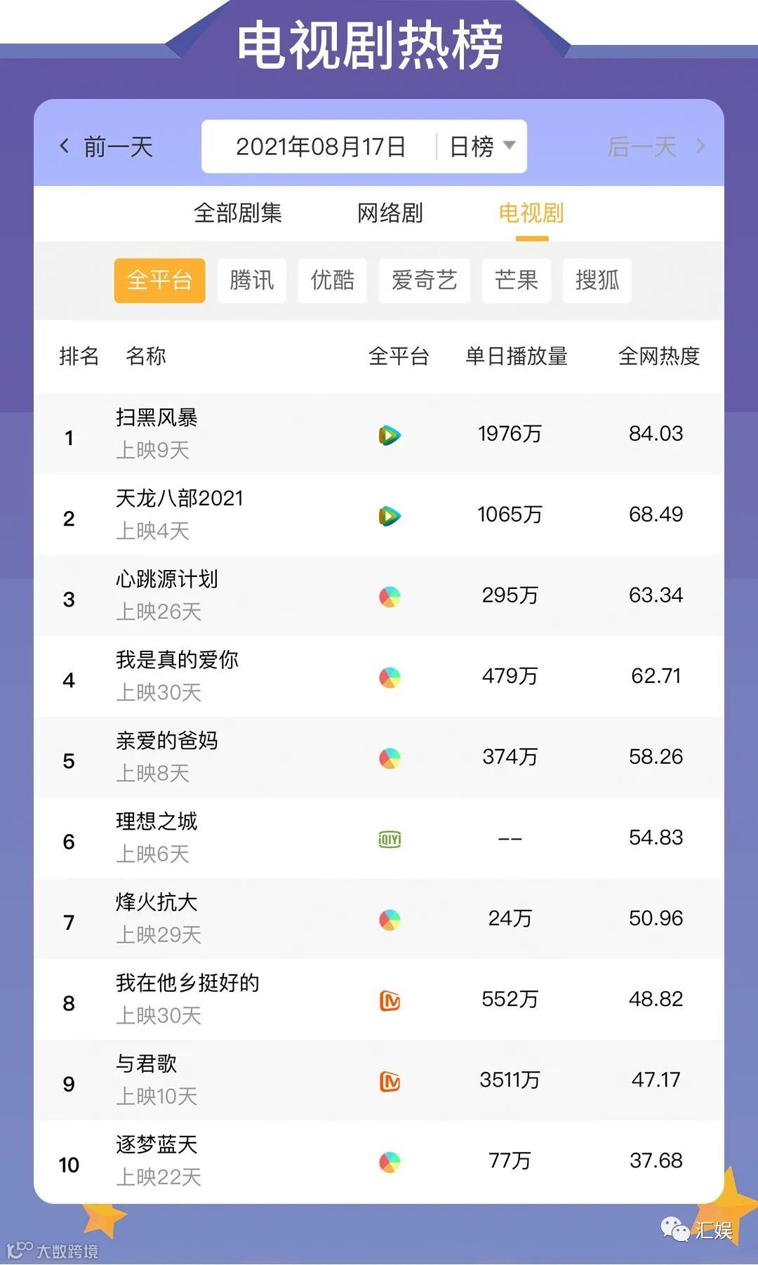 汇娱数据 | 2021.08.17 影视、综艺、艺人全网平台热度指数
