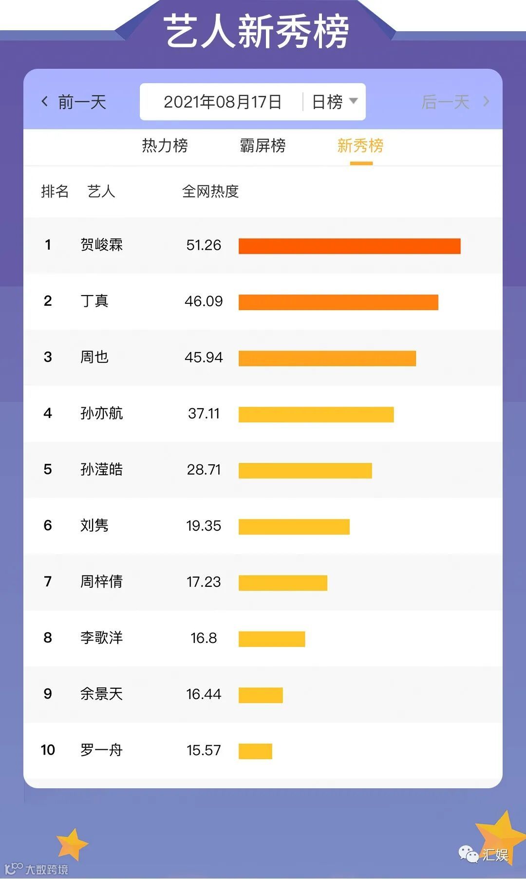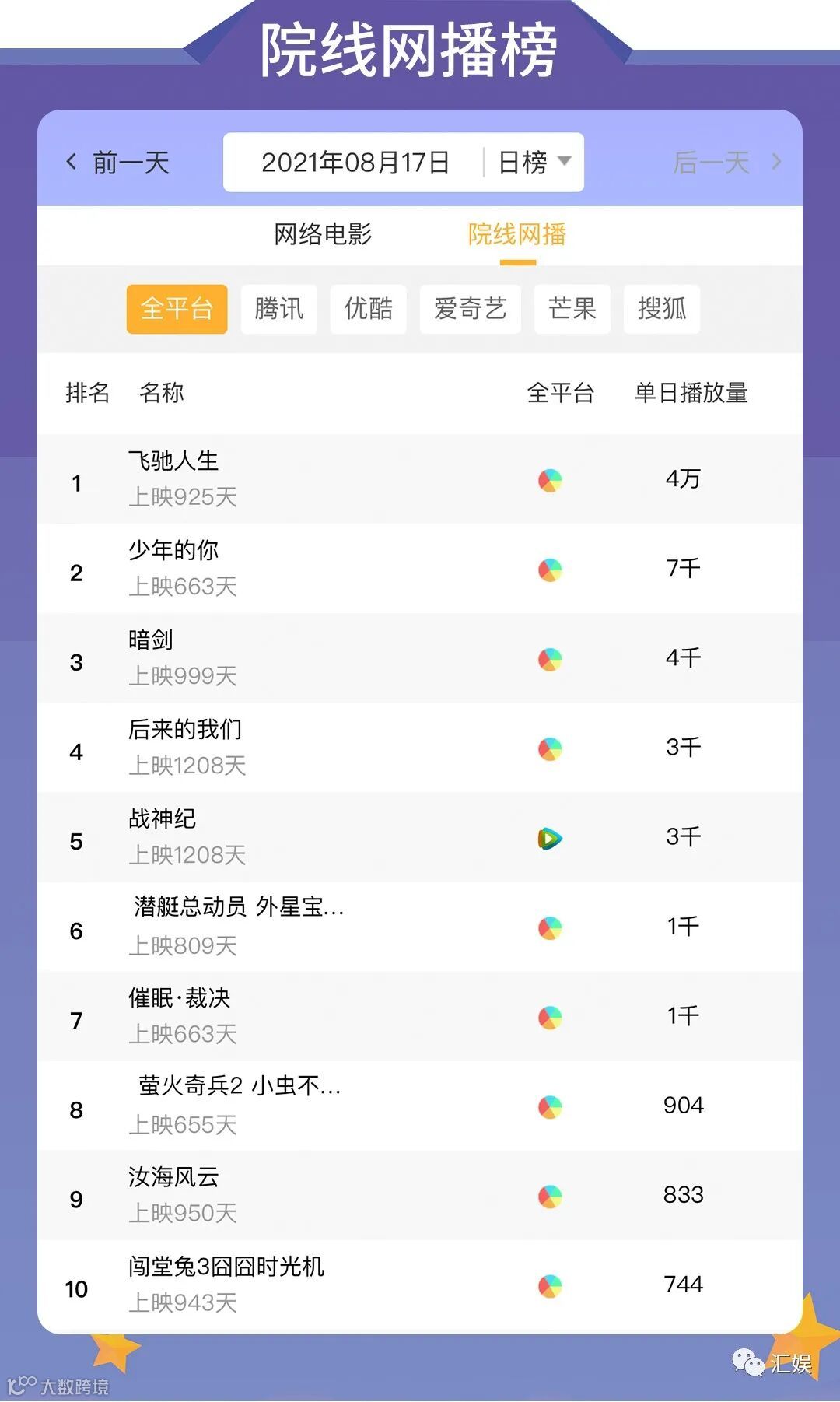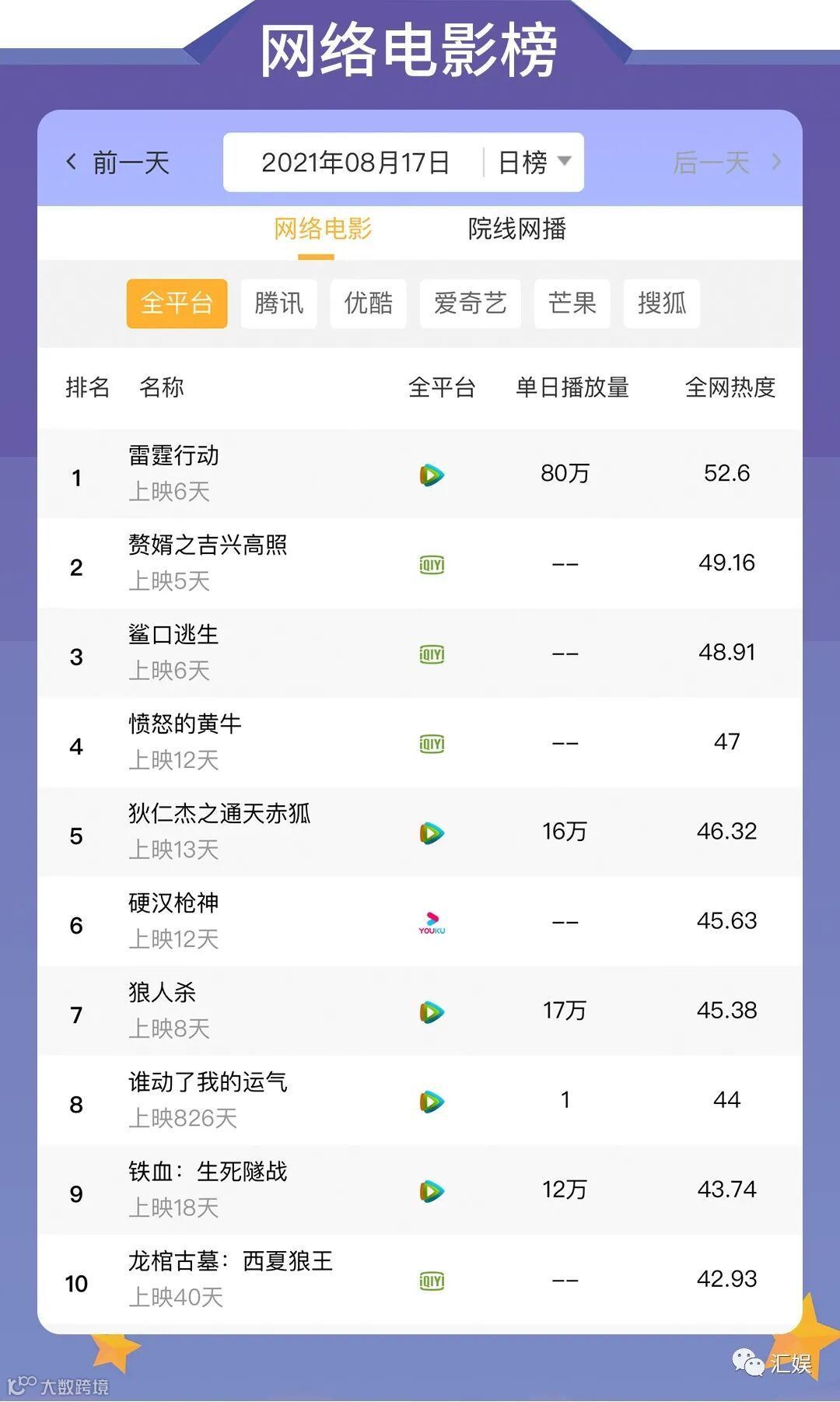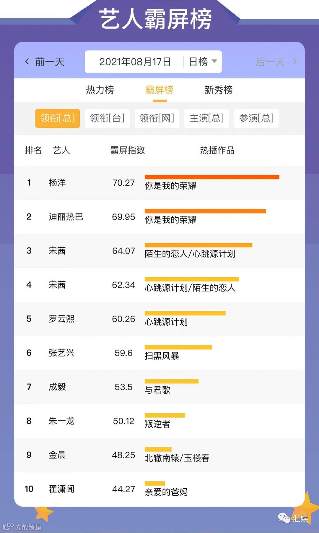 汇娱数据 | 2021.08.17 影视、综艺、艺人全网平台热度指数
