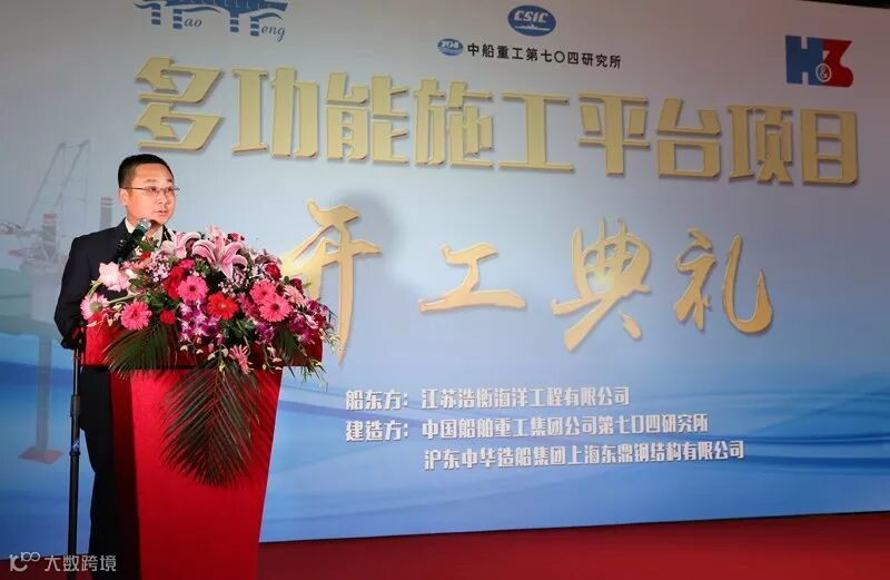 5月15日,多功能施工平台在上海东鼎钢结构公司开建。公司副总迟本斌致 辞。