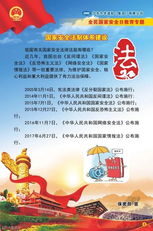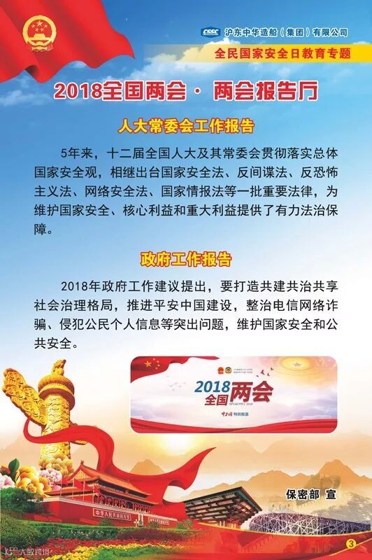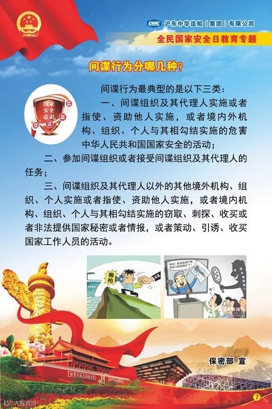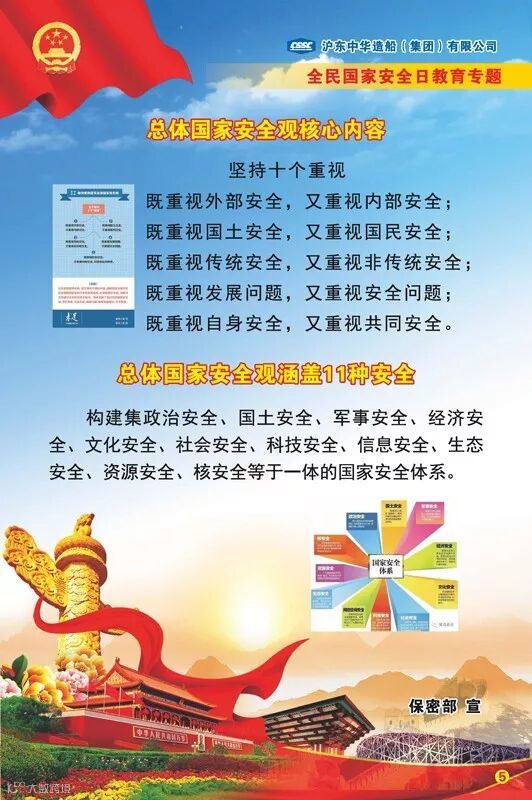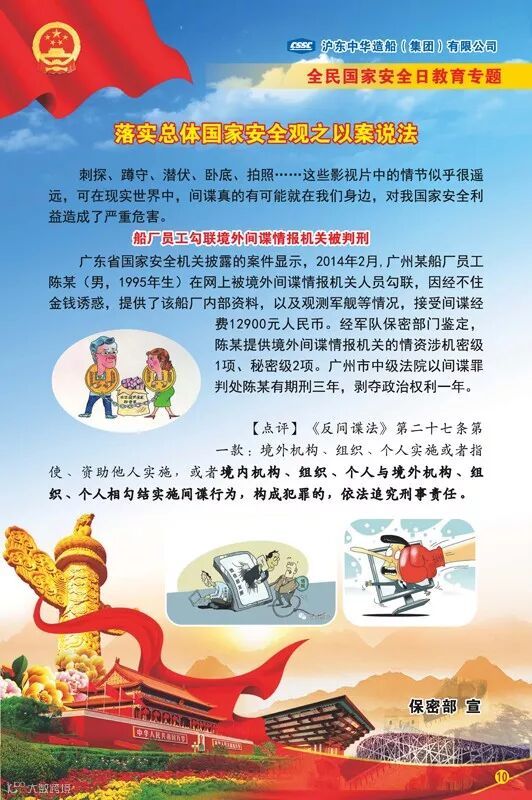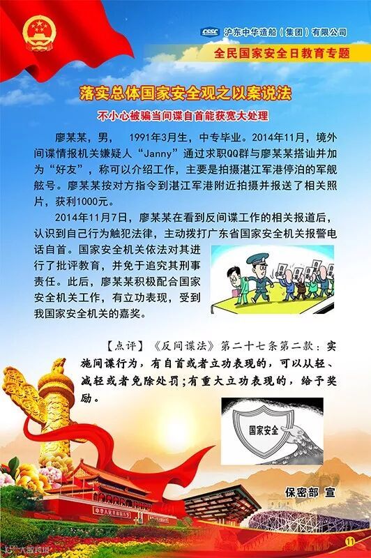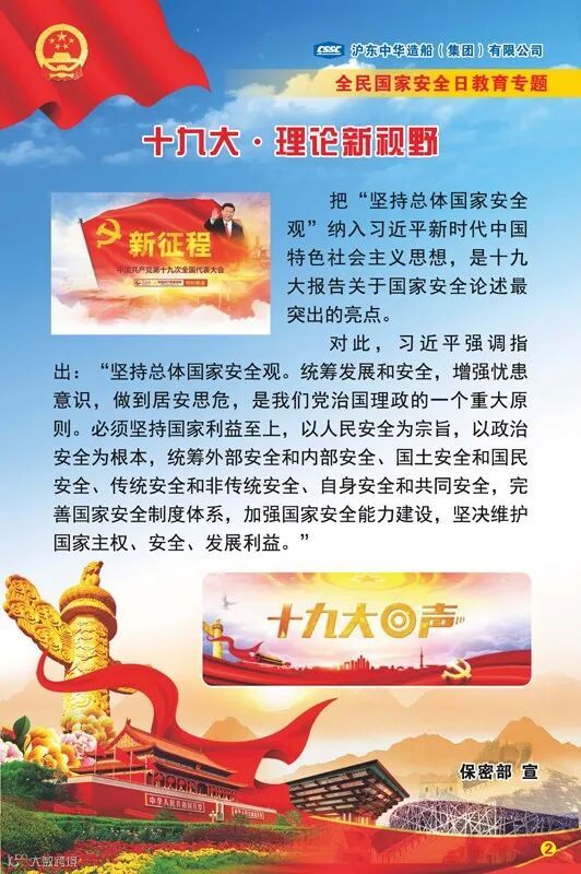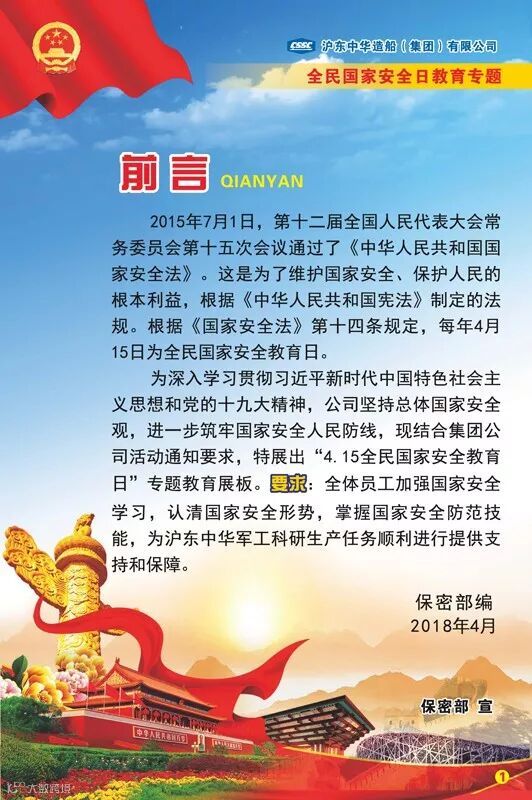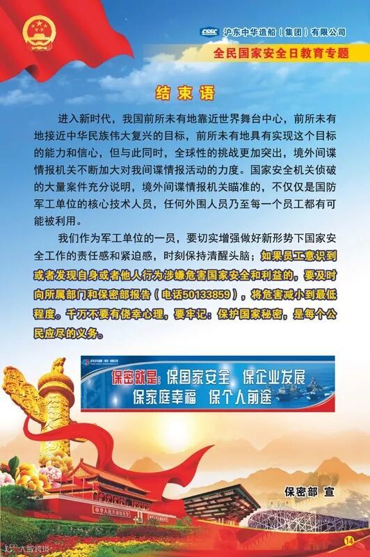 沪东中华全员要切实增强责任感和紧迫感,时刻保持清醒头脑,做好新形势下国家安全工作,为公司军工科研生产任务顺利进行提供支撑和保障。如果员工意识到或者发现自身或者他人行为涉嫌危害国家安全和利益的,要及时向所属部门和保密部报告(电话021-50133859),将危害减小到最低程度。