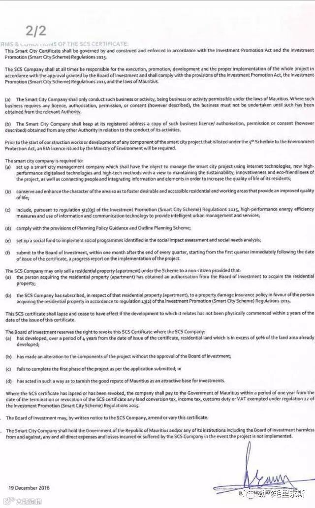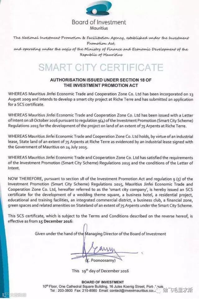 2016年12月19日,毛里求斯投资局正式向晋非公司颁发了智慧城市证书。智慧城市(SCS)证书的获得,标志着毛里求斯晋非园区开发婚庆殿堂,商务酒店,住宅项目,教育和培训设施,综合商业区,会所,金融中心区,绿地和相关的便利设施,总用地面积为75阿邦国有土地将享受毛里求斯政府给予的支持政策。