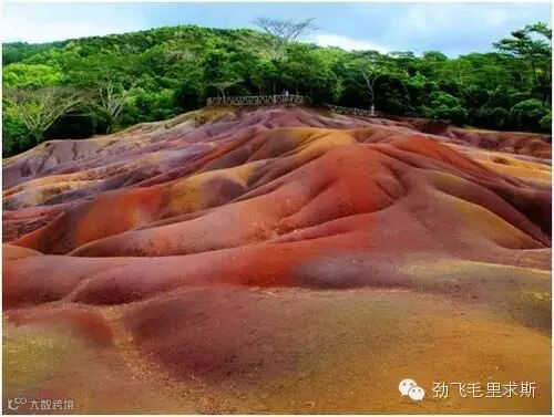 夏马尔的七色土自然景观,就像是上帝在毛里求斯打翻的调色板,装饰着岛国南部火山地貌的质感。站在木板搭建的栈道上,脚下一个个波浪起伏般的小山丘,在阳光的照射下折射出红、棕、灰等不同的色彩。据说,早在19世纪初,一位法国人在开发种植甘蔗园的时候,发现这儿的土地色彩异常艳丽,犹如彩虹一般顺着山坡起伏,伸展左右。七色土的各个小坡所呈现出的蓝、绿、红、黄等颜色,其实是由于火山灰的侵蚀作用而形成的。仔细观察七色土中的颜色并没有明显的分层,常常是红色中混杂着蓝色,蓝色中凝结着黄色,黄色中又泛起绿色,颜色各异却又互融于彼此,这片魔幻般的自然地貌,不仅成为世界上唯一的自然地质景观,也成为毛里求斯旅游的经典印象。