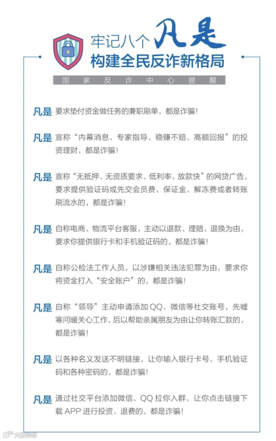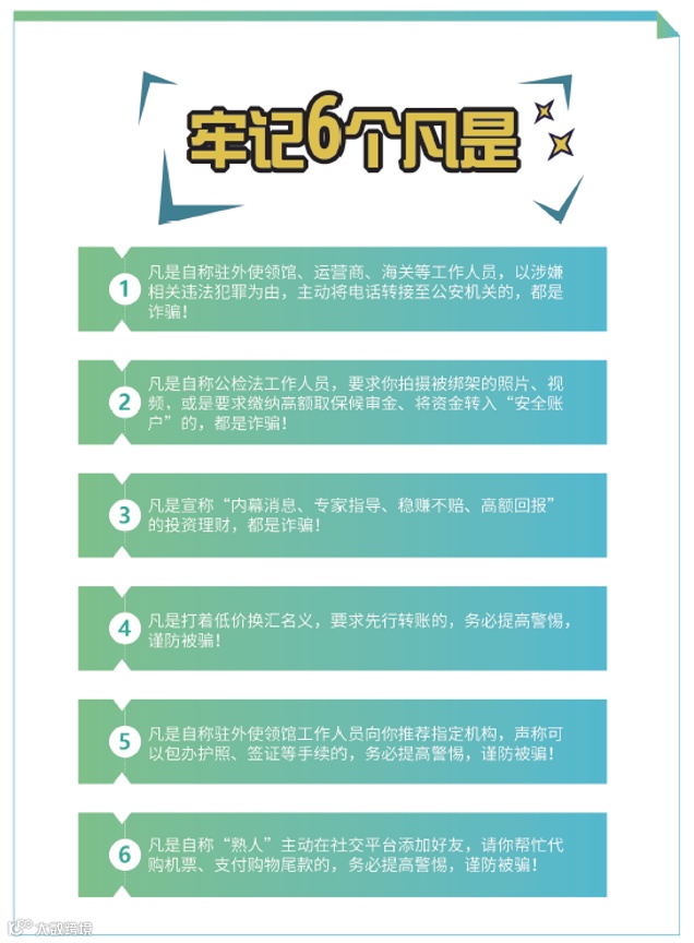 登录中国公安部网站下载《2023版防范电信网络诈骗宣传手册》 以及2024年6月发布的《海外防范电信网络诈骗宣传手册》https://www.mps.gov.cn/n2255079/n4876594/n5104076/n5104077/c9079308/content.htmlhttps://www.mps.gov.cn/n2255079/n9365801/n9631540/n9631547/c9632176/part/9632188.pdf