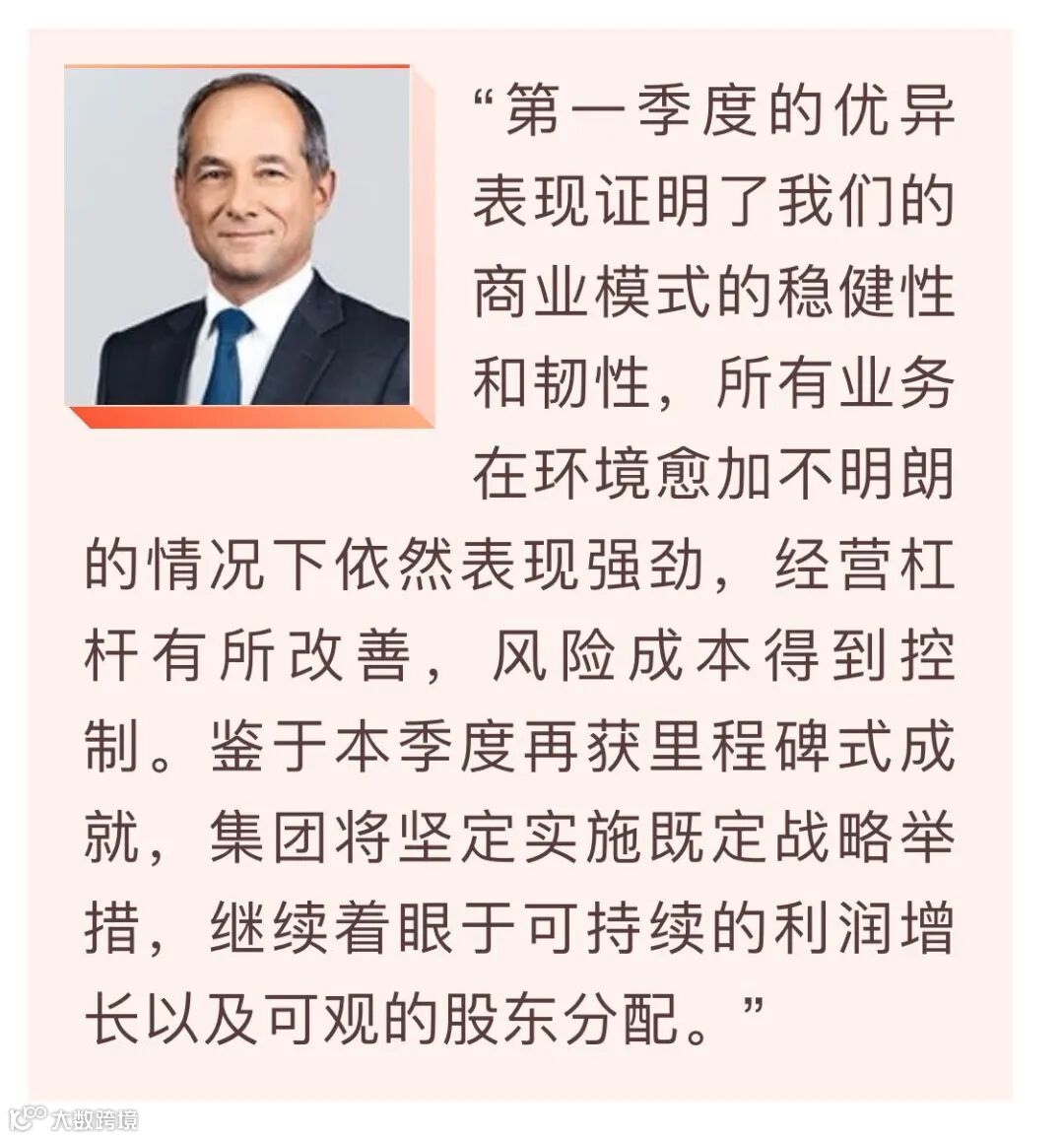 总体而言,法兴集团2022年第一季度经调整口径的净收入达15.7亿欧元(报告期账面数据为8.42亿欧元),较2021年同比增长21.3%。集团盈利能力强劲,经调整口径的有形股本回报率达11.9%。