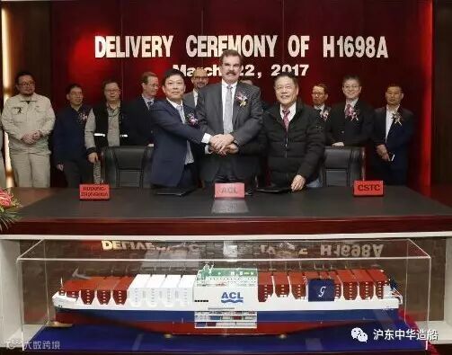 ACL公司总经理、首席执行官安德鲁·阿伯特,ACL母公司意大利格里马迪集团新造船项目经理佩鲁济·马尔默、意大利船级社中国区总经理曹之腾、美国船级社大中华区副总裁达伦·莱斯科斯基、中国船舶工业贸易公司高级专务王燕中和长兴造船副总经理胡宏宇等出席了交船仪式。