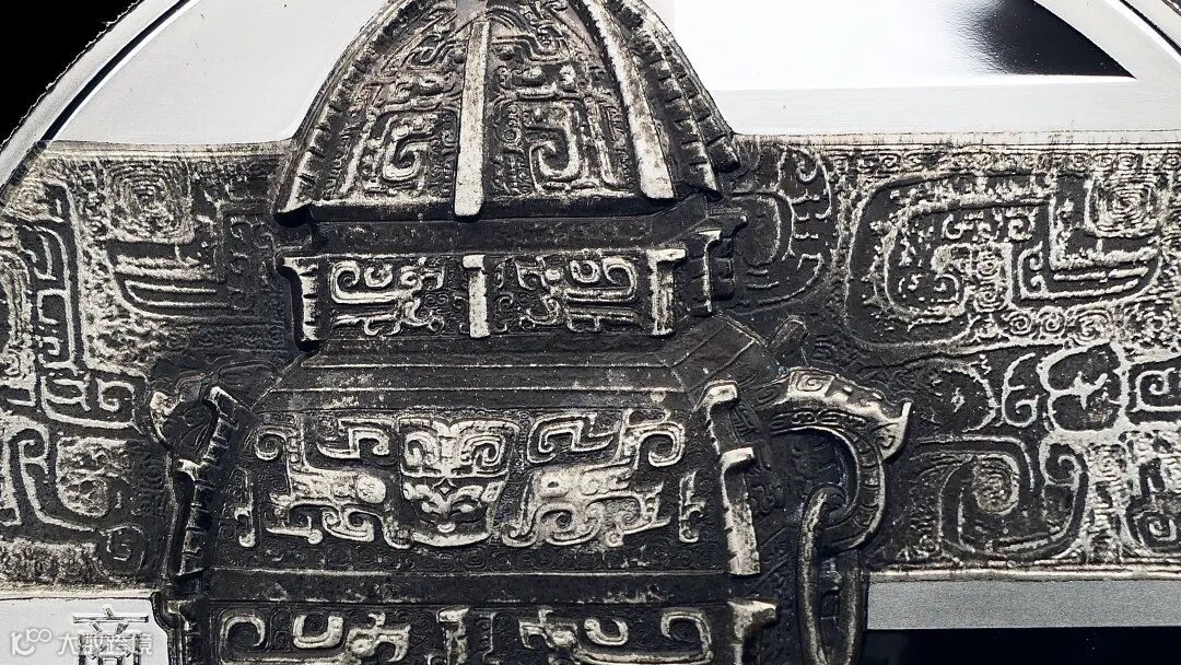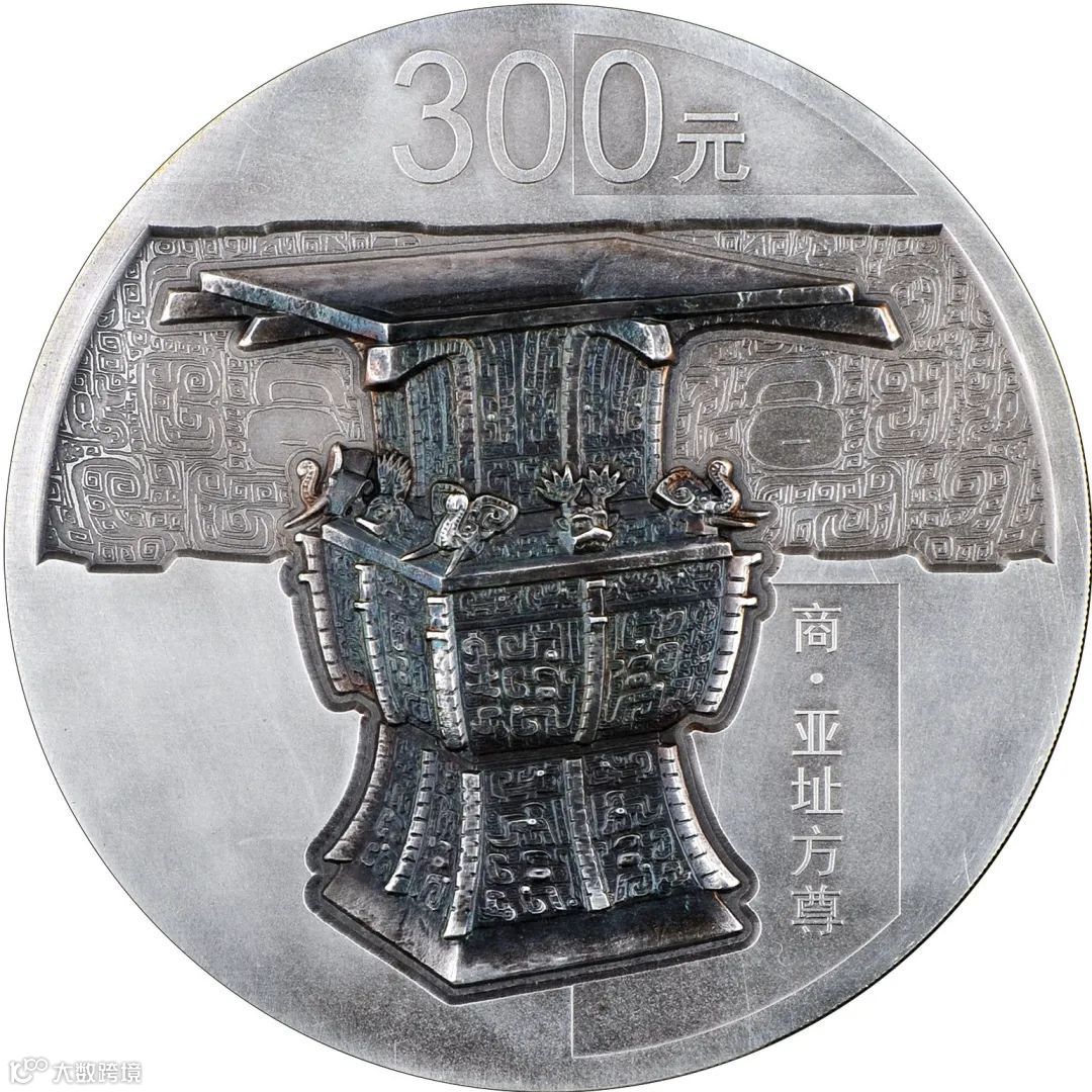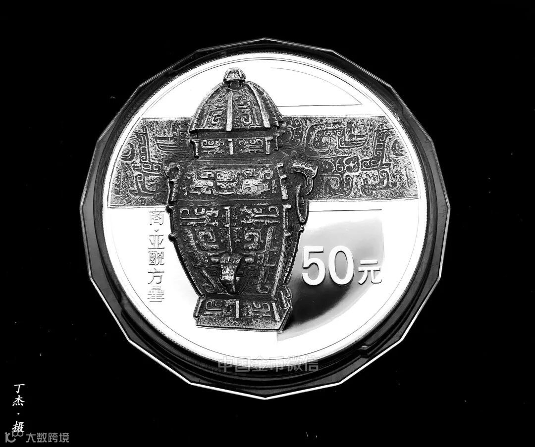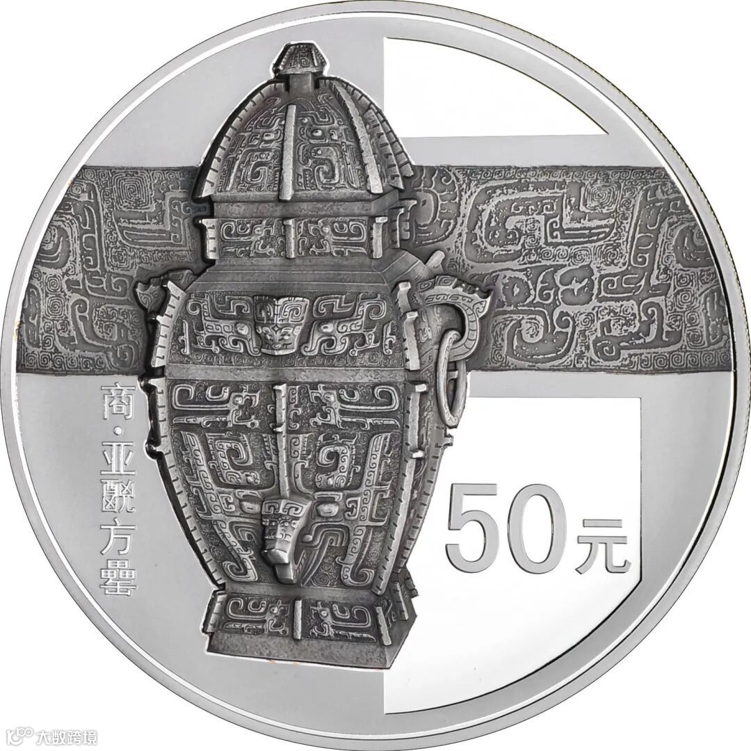 中國青銅器金銀紀念幣(第3組)1公斤銀幣背面圖案為商代亞址方尊,襯以該器物獸面紋樣等裝飾組合設計。細觀此銀幣,亞址方尊器形採用高浮雕,幣面細砂淺噴,仿古做舊成淺灰色、主紋飾加強作舊成深灰褐色、方尊器身經仿古青銅局部做舊處理成深褐色,方尊之外的幣面採用仿古銀做舊工藝。
