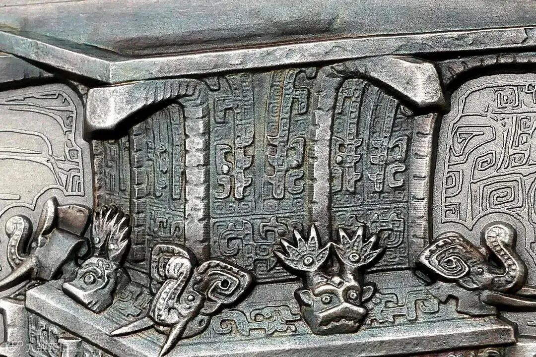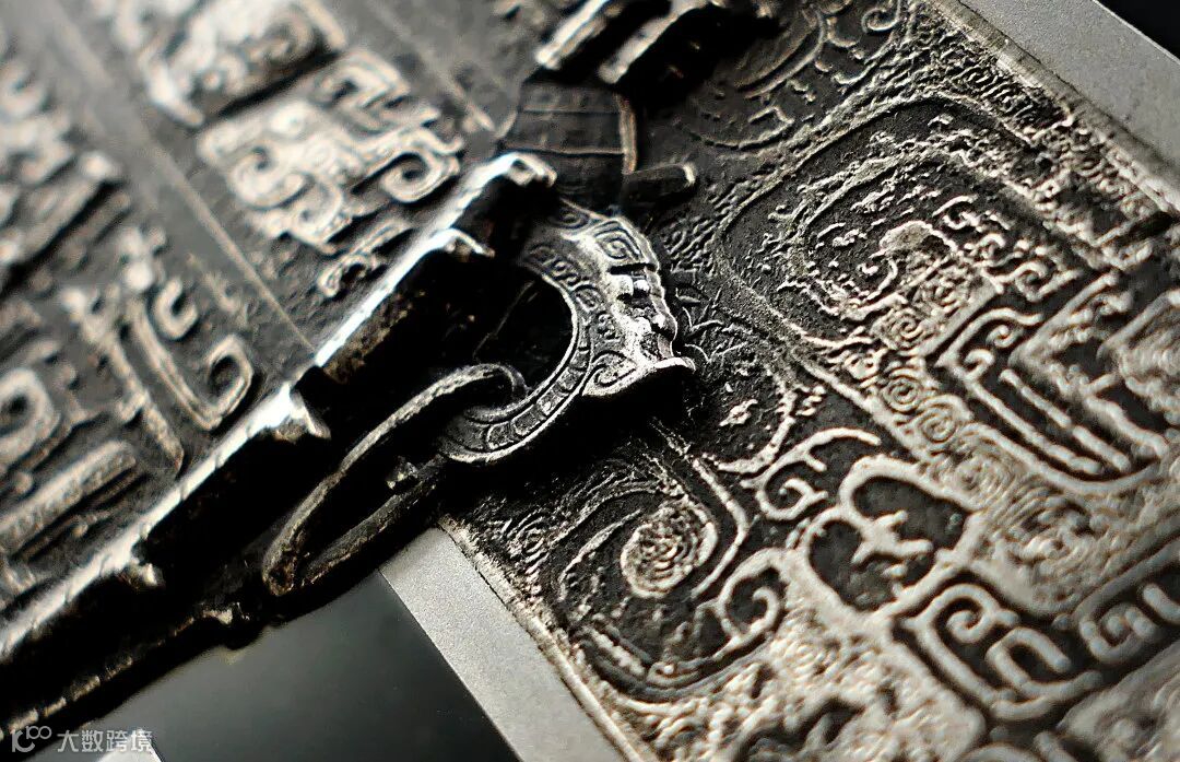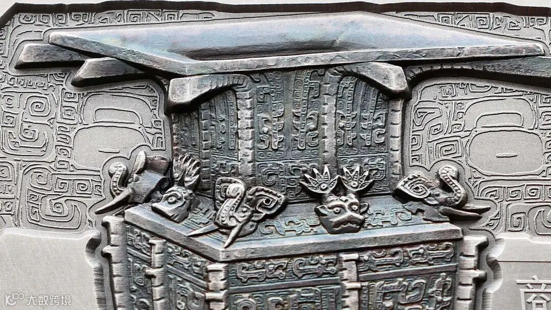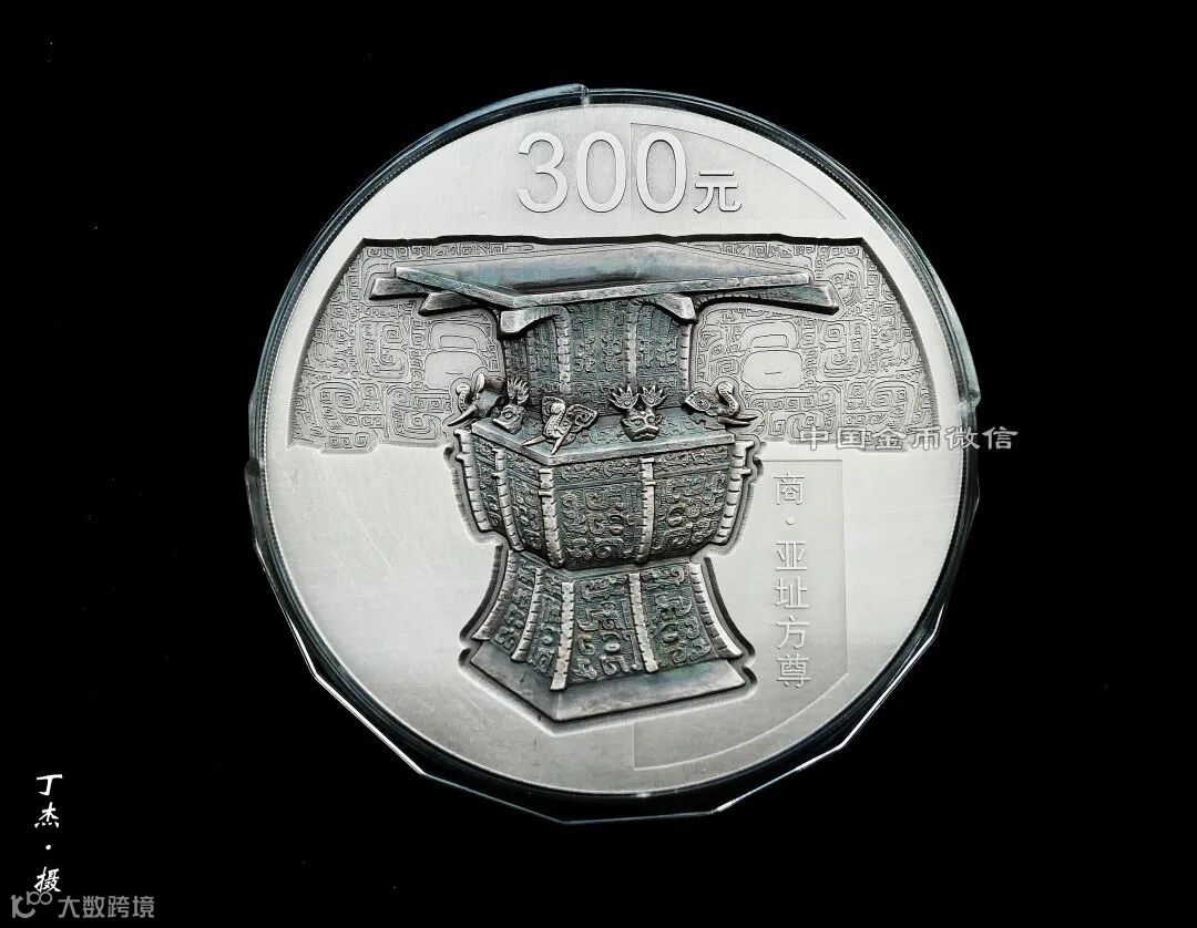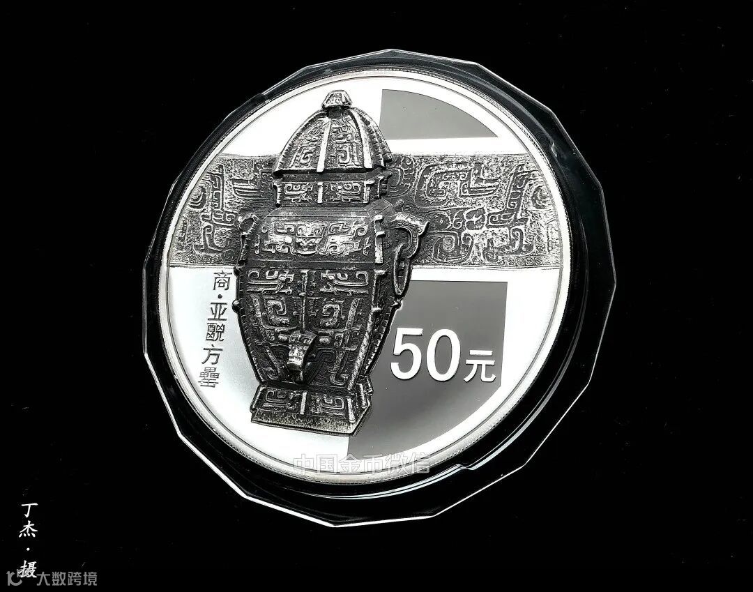 中國青銅器金銀紀念幣(第3組)1公斤銀幣背面圖案為商代亞址方尊,襯以該器物獸面紋樣等裝飾組合設計。細觀此銀幣,亞址方尊器形採用高浮雕,幣面細砂淺噴,仿古做舊成淺灰色、主紋飾加強作舊成深灰褐色、方尊器身經仿古青銅局部做舊處理成深褐色,方尊之外的幣面採用仿古銀做舊工藝。
