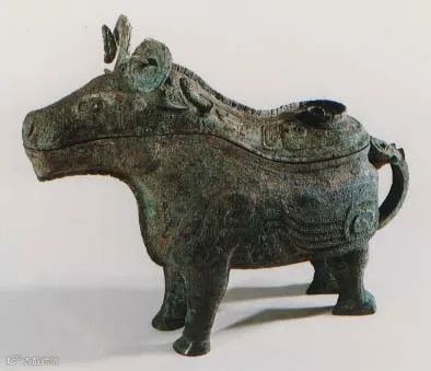 司母辛觥是1976年河南安陽殷墟婦好墓出土的盛酒器,器身奇特,前部似牛,呈立獸狀,頭上有捲曲的犄角,中脊至尾有卷龍紋,後部呈鳥狀,足為兩蹄兩爪,尾部有獸首形鋬。
