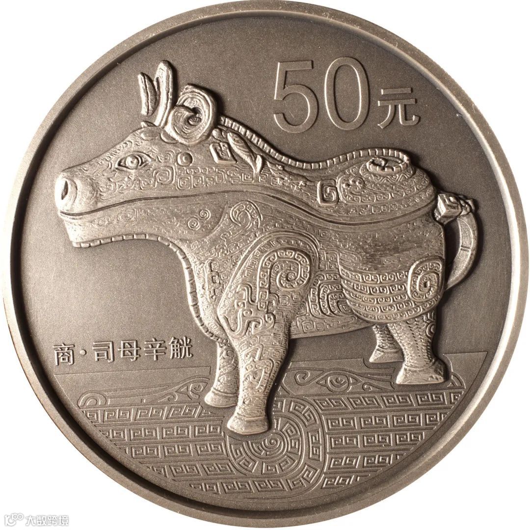 中國青銅器金銀紀念幣(第2組)5盎司銀幣背面圖案為商代司母辛觥,襯以該器物典型紋樣裝飾組合設計。