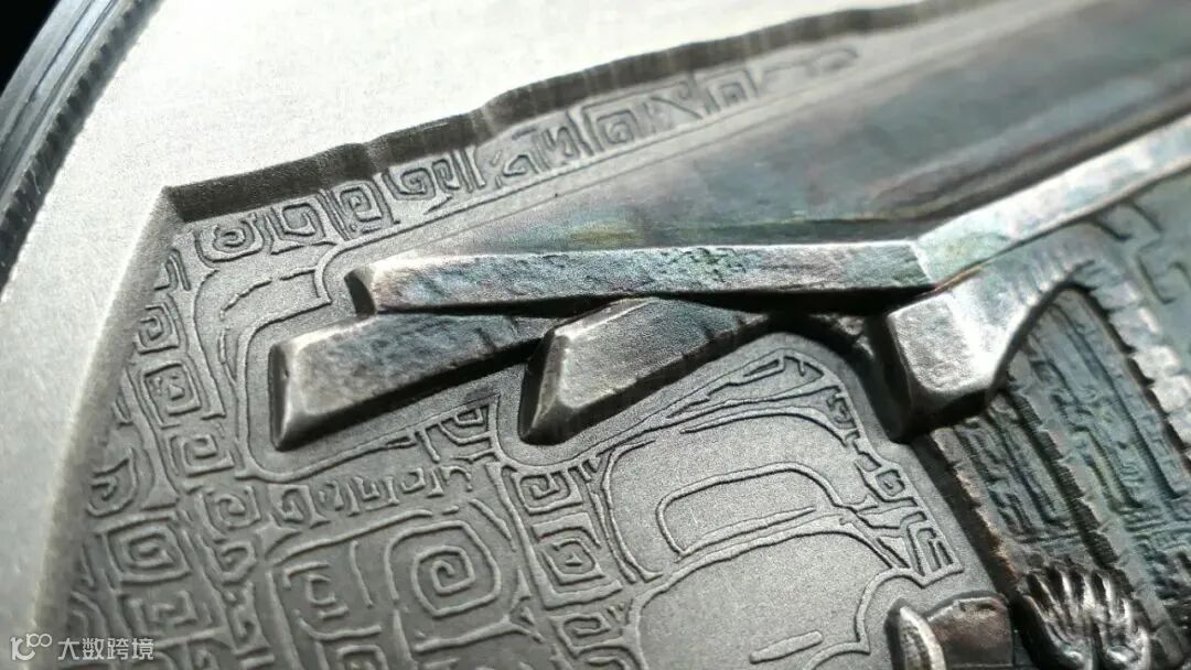 該枚幣運用了“銀幣做舊工藝”和“浮雕陰刻工藝”,整個幣面分三個層次,以不同的“黑白灰”色調展現給大家。