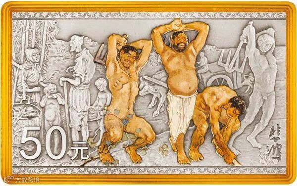 其中5盎司長方形銀質紀念幣背面圖案為徐悲鴻所作的巨幅水墨畫《愚公移山圖》。該幣的工藝應用可一句話概括為“化繁為簡,化簡為繁。”化繁為簡是將複雜繁多的浮雕人物景色採用仿古做舊處理,而非複雜地多層次噴砂研磨,使畫面和諧統一。化簡為繁是採用局部彩色、邊部鍍金等多種後期工藝對單一色調畫面進行提升,最終讓幣面協調、完整。
