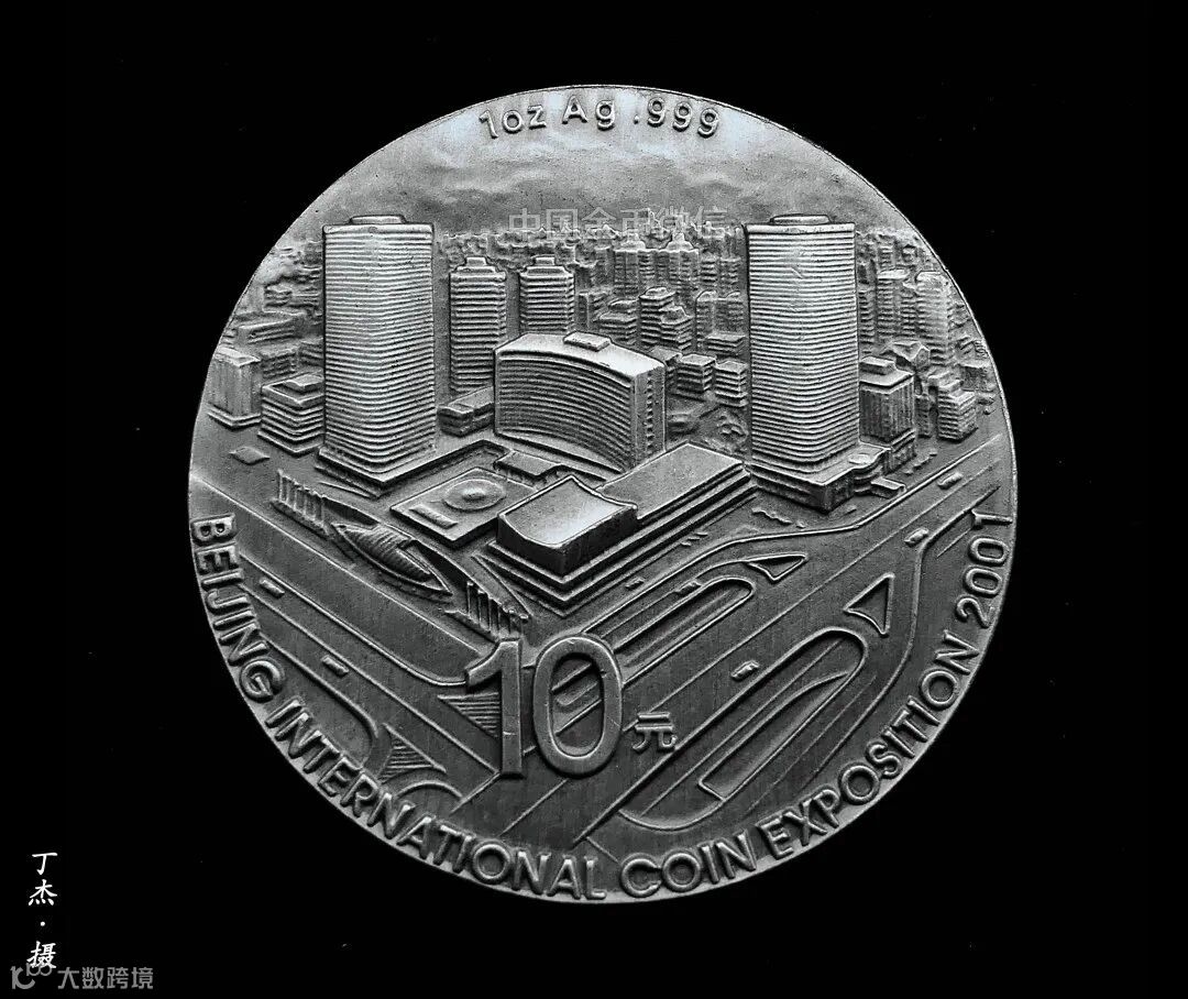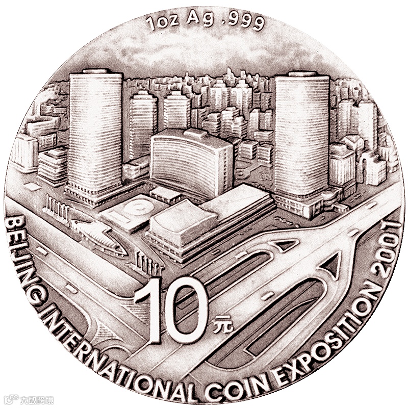 2001北京國際錢幣博覽會紀念銀幣是錢幣博覽會系列中個性尤為突出的一枚,它融入了大銅章的設計風格,1盎司銀幣的直徑由40毫米改為32毫米,在不影響銀幣重量的前提下,增加產品的厚度,凸顯高浮雕工藝製作的立體感,增強視覺藝術效果。這枚幣是我國貴金屬紀念幣中首枚採用仿舊工藝的銀幣,增添了一份厚重感。