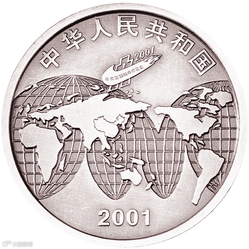 該幣正面圖案是2001北京國際錢幣博覽會會標,世界地圖裝飾圖。圖案中地球版圖運用了凸起和凹陷兩種浮雕方法,使五大洲相映成輝,畫面效果富有變化,體現了錢幣博覽會是中外錢幣界的一個開放、多元、互動的理想平臺和橋樑,極大地促進了中國錢幣文化與世界的融合交流,推動了中國錢幣事業的健康發展。