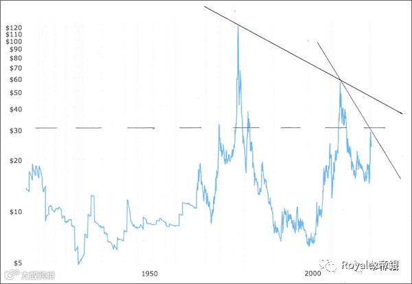 圖表上的虛線為30美元/盎司,這意味著上個世紀白銀的價格走勢幾乎都低於該水準。在所示的105年中,白銀價格僅兩次超過30美元,維持在該水準之上的時間略超出4年。