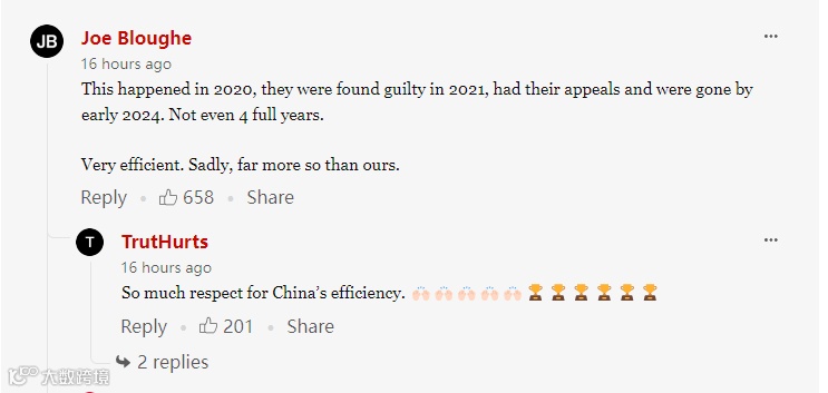 张波、叶诚尘的所做所为也激怒了海外网友,留言中对他们伏法简直是一边倒的拍手称快。甚至很多英美网友还觉得惩罚应该更重一点。