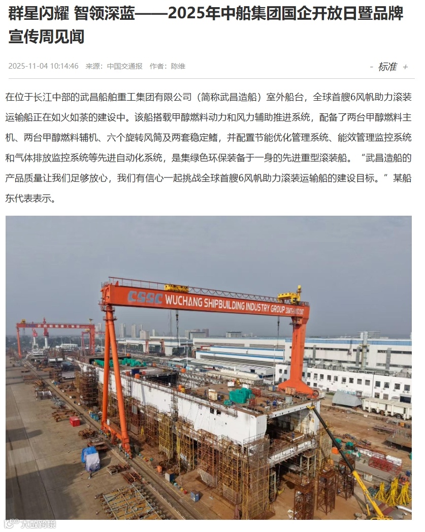 中国环境报《全球首艘风帆动力甲醇双燃料滚装运输船进入关键工期》 (2025/11/3)